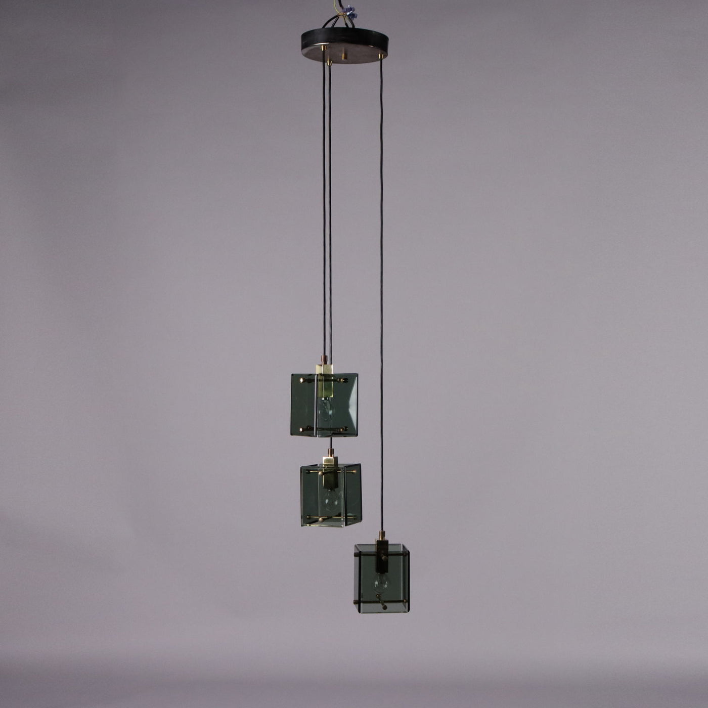 Vintage Italian-made ceiling lamp made of lacquered metal with three light points at different heights characterized by a smoked glass lampshade and brass structure. vintage chandelier, design ceiling lamp, design chandeliers, ceiling lamp.
