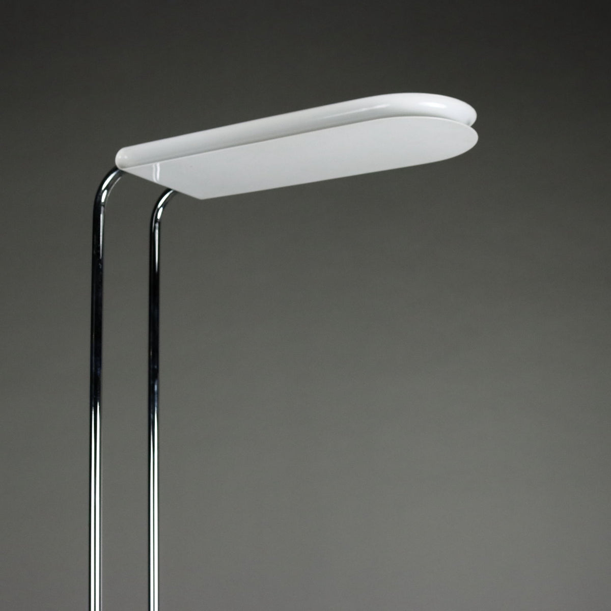 Reflected light floor lamp, with marble base, double metal stem and white lacquered aluminium diffuser. Design floor lamp, vintage floor lamp, 1970s floor lamp, 1960s floor lamp, 1950s floor lamp, floor lamp.