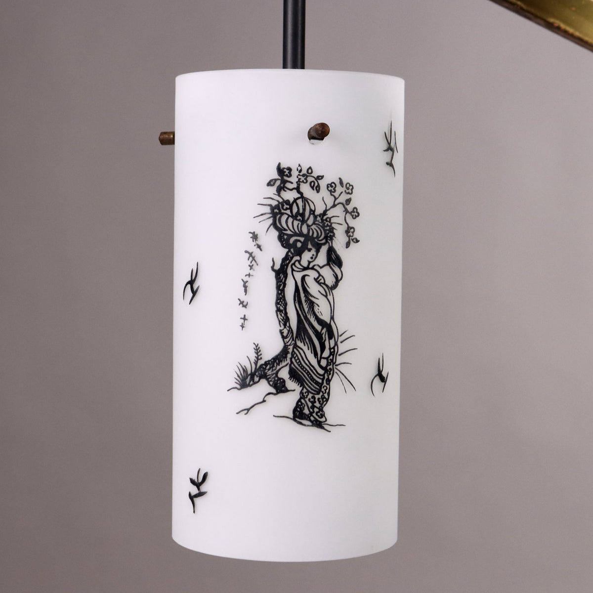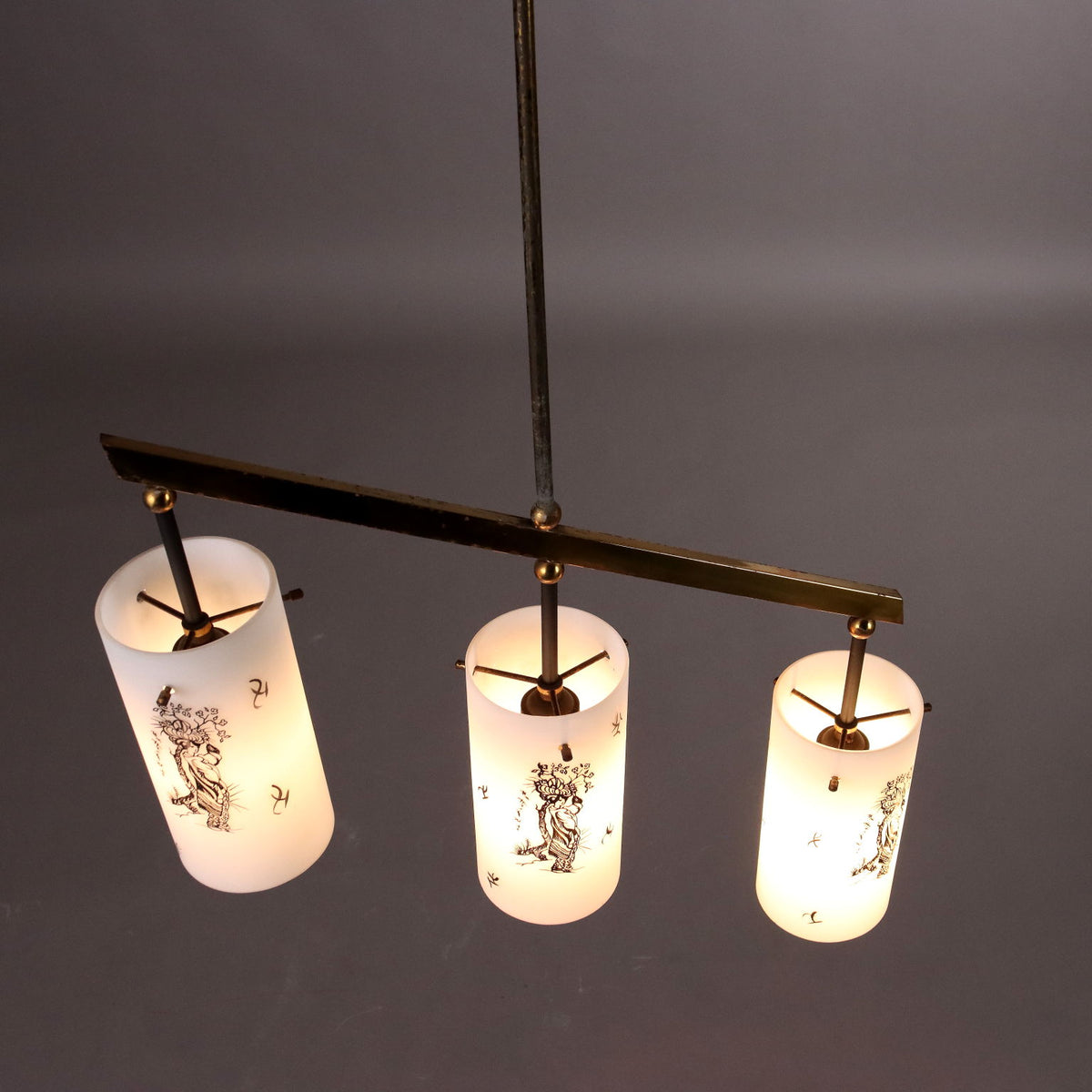 Italian-made three-light ceiling lamp with opal glass diffusers with decorations, brass structure. vintage chandelier, design ceiling lamp, design chandeliers, ceiling lamp.