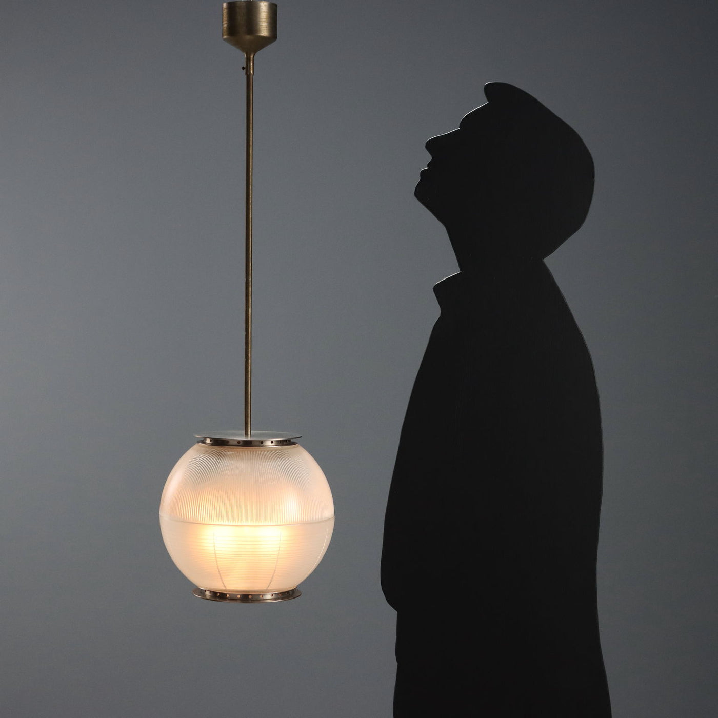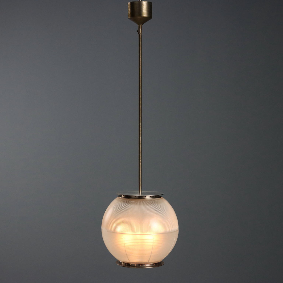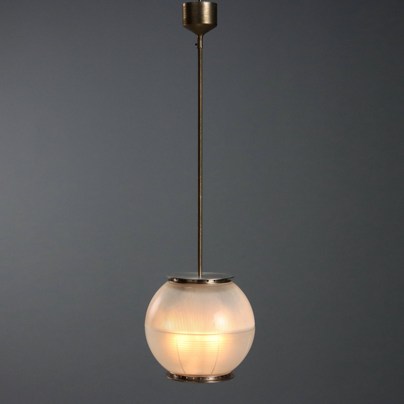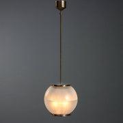 Elegant pendant lamp with brass structure, double cup diffuser in striped printed glass. vintage chandelier, design ceiling lamp, design chandeliers, ceiling lamp.