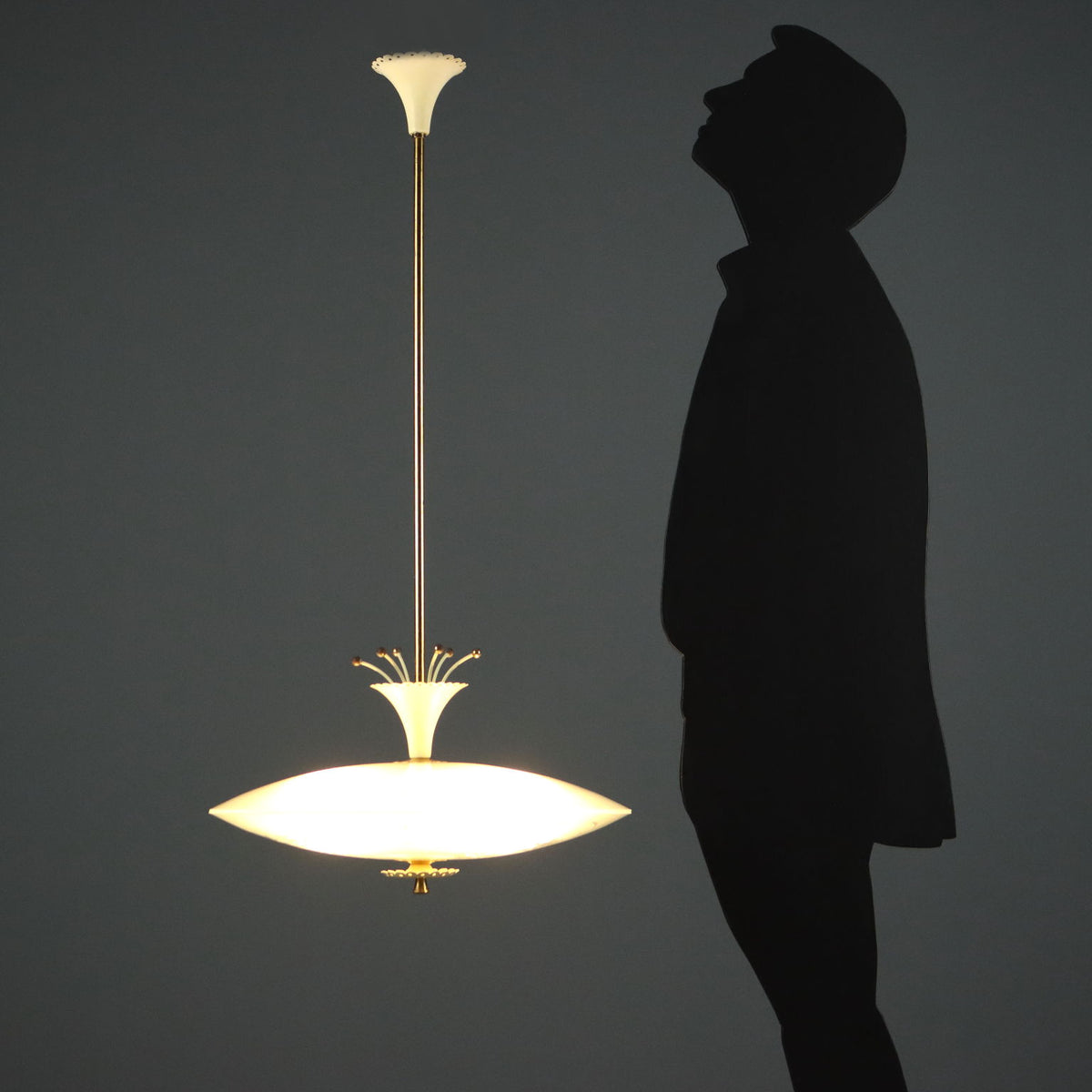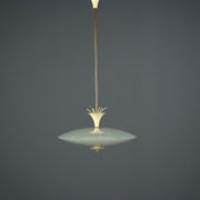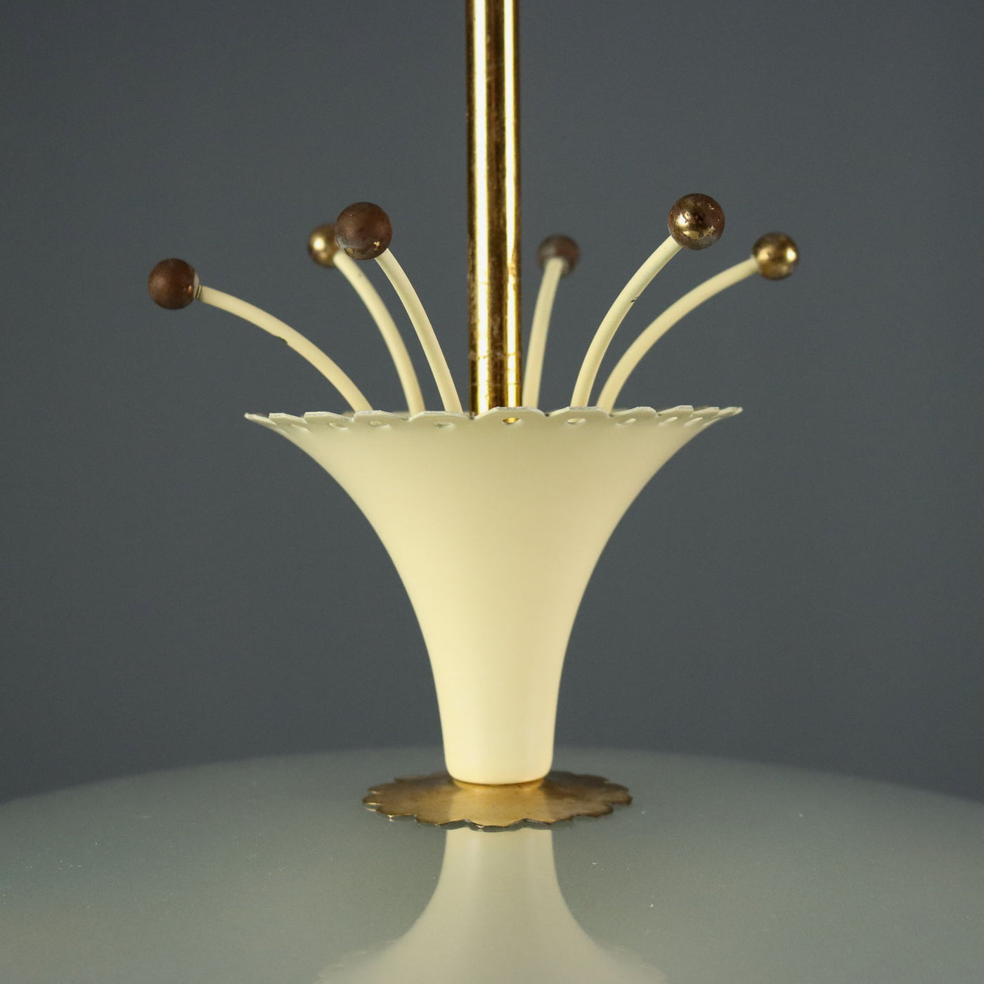 Vintage ceiling lamp in white enameled aluminum and brass with worked glass. vintage chandelier, design ceiling lamp, design chandeliers, ceiling lamp.