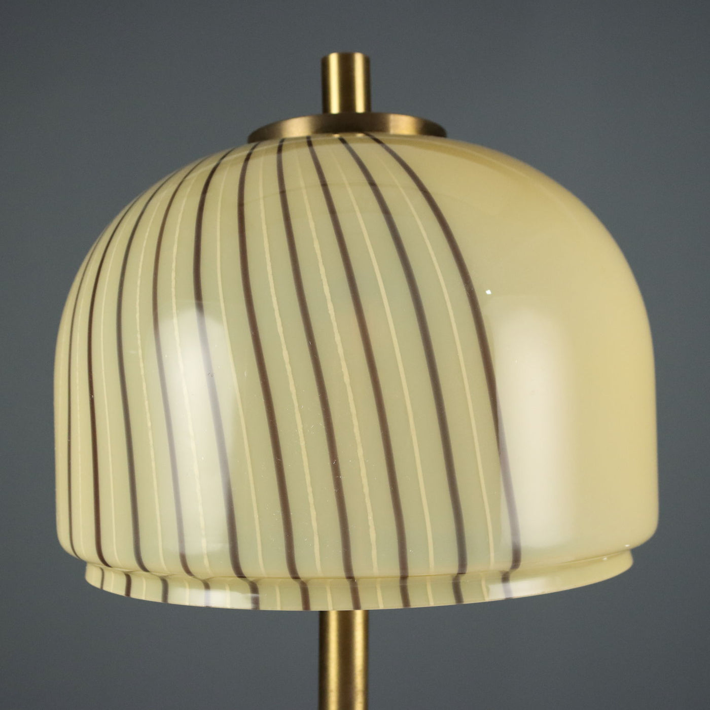 Elegant vintage table lamp with brass frame, lampshade in worked glass in beige tones with striped decorations. 1970s table lamp, 1960s table lamp, table lamp, design table lamp.