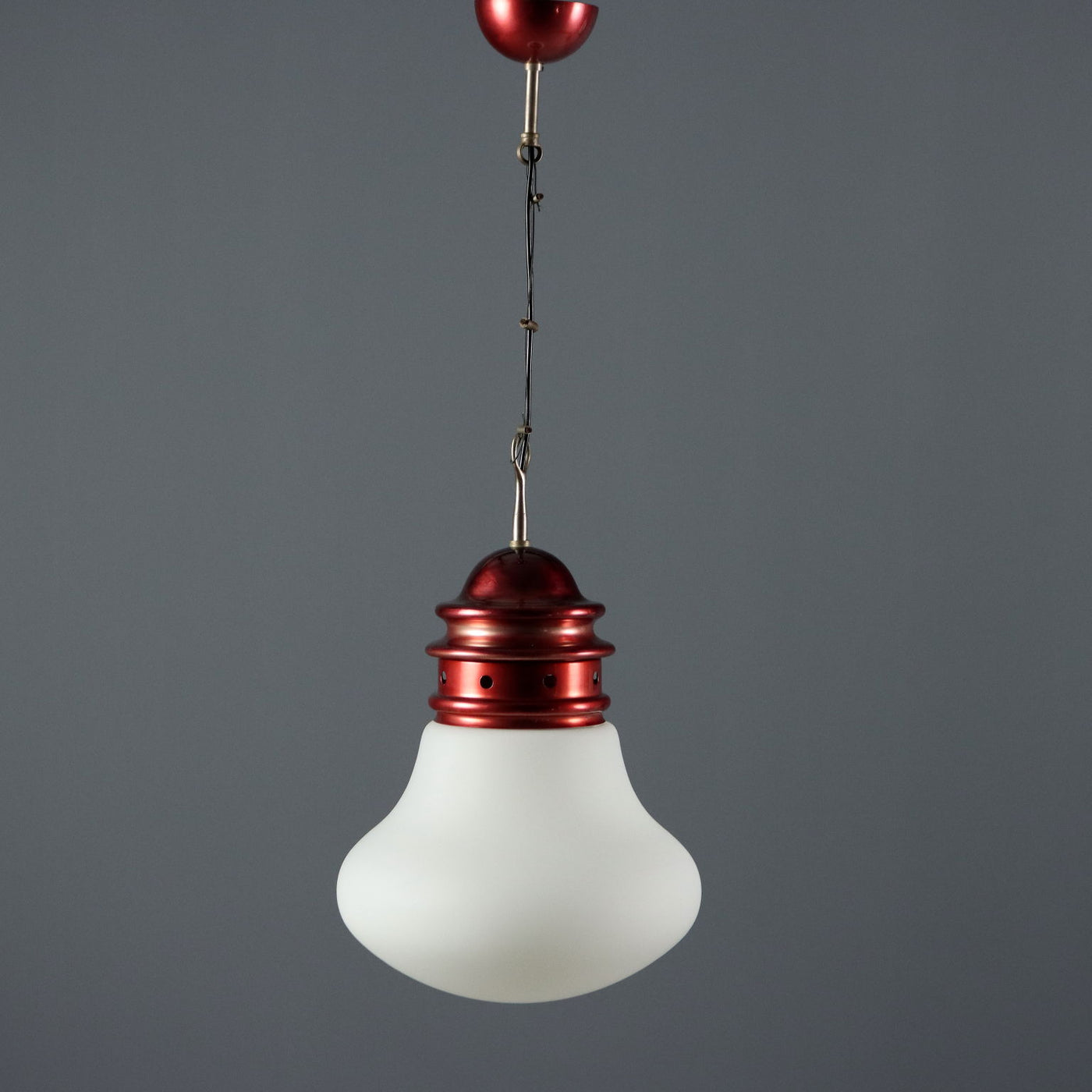 Pair of vintage ceiling lamps with red aluminum frames and opal glass diffusers. Weight: 3.4 kg. vintage chandelier, design ceiling lamp, design chandeliers, ceiling lamp.