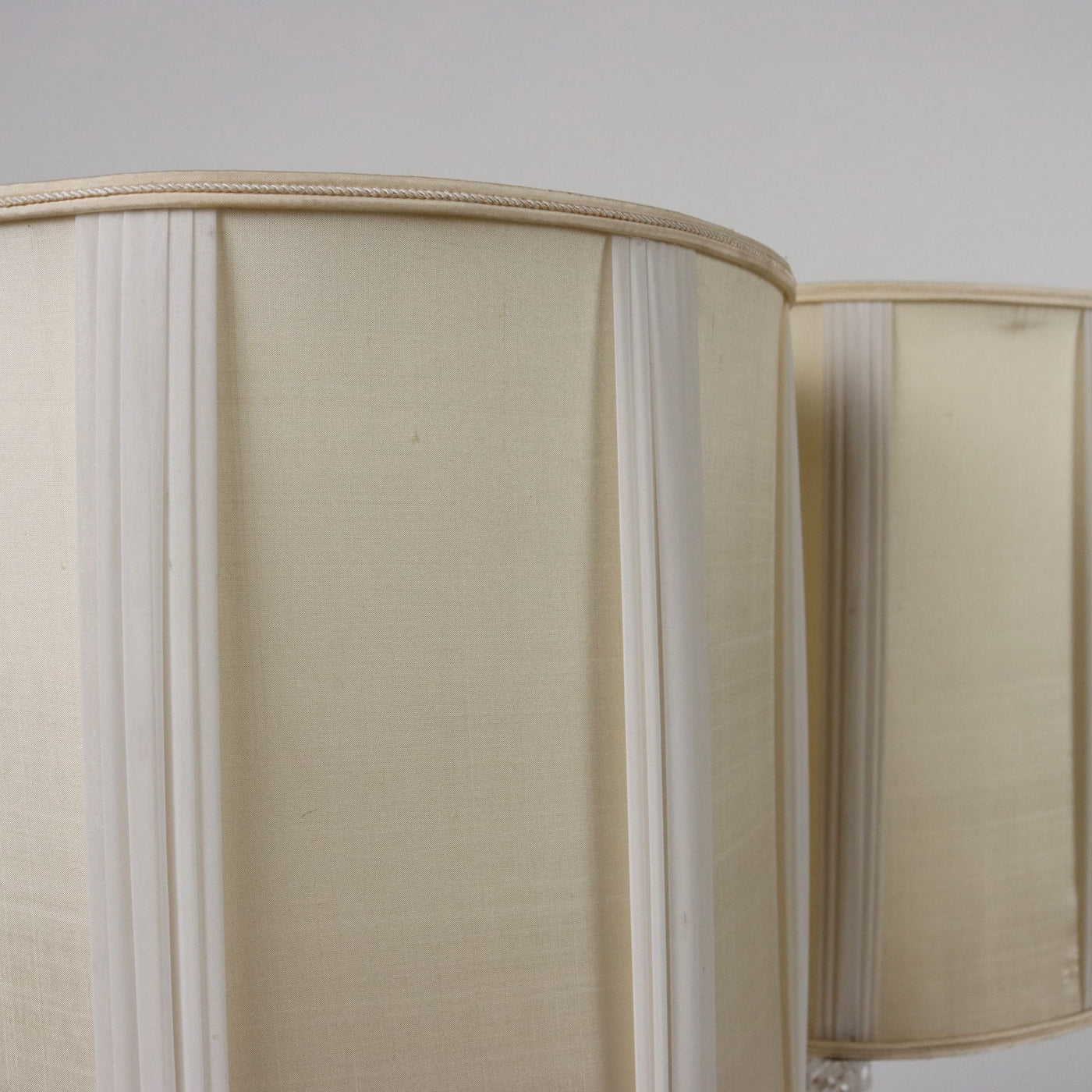 Pair of lamps in cut crystal and bronze with fabric lampshades. Adhesive label of the manufacturer under the base of a lamp. lampshade, 1970s table lamp, 1960s table lamp, table lamp, floor lamp, chandelier, ceiling lamp, candlestick, candle-holders, wall lamp.