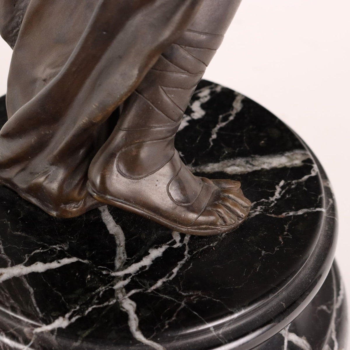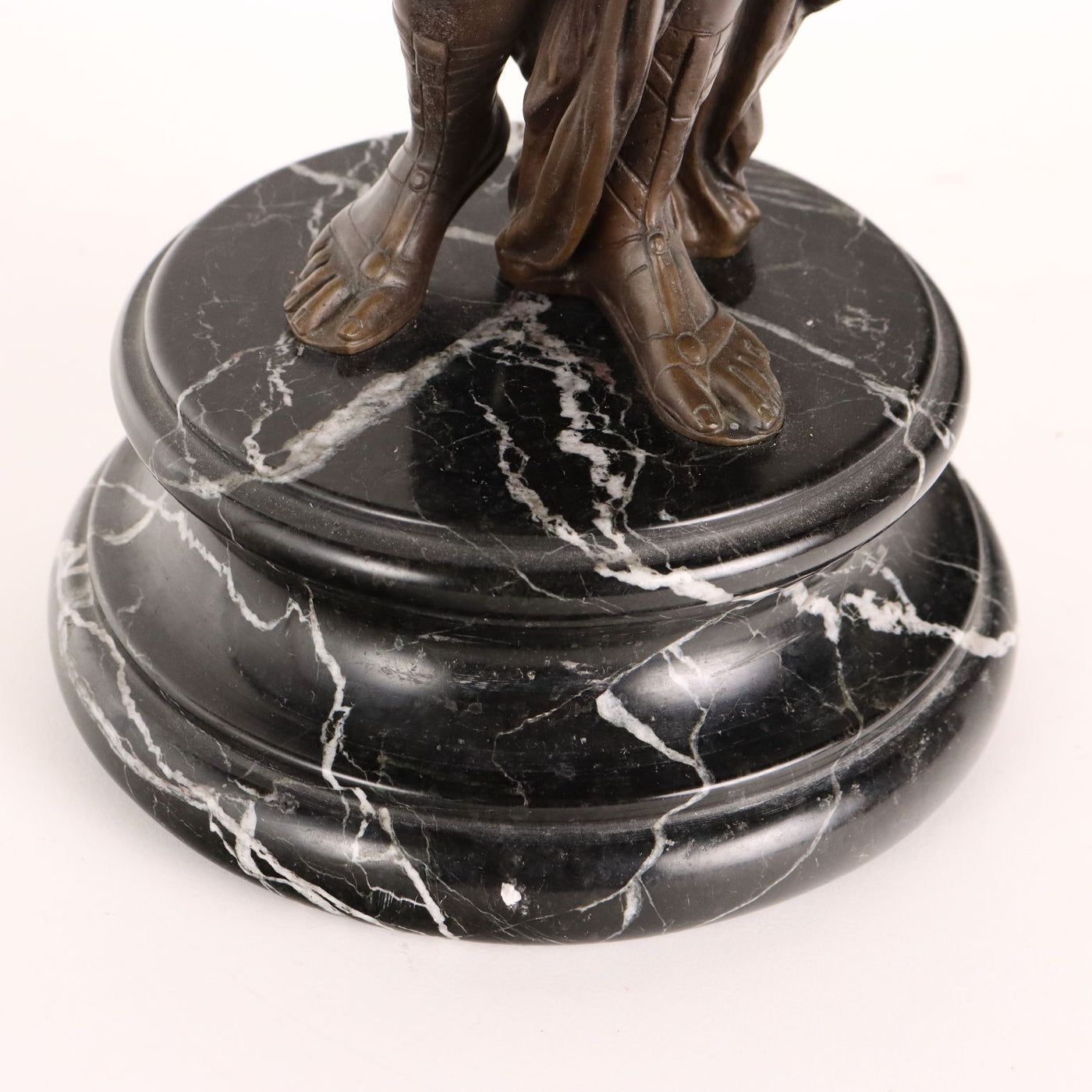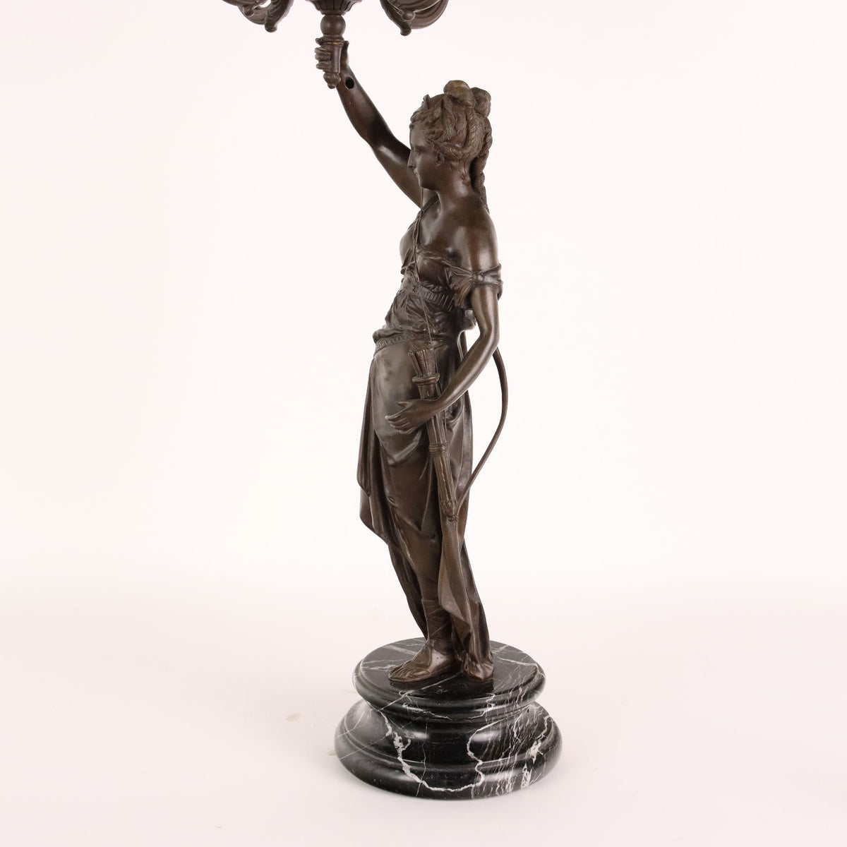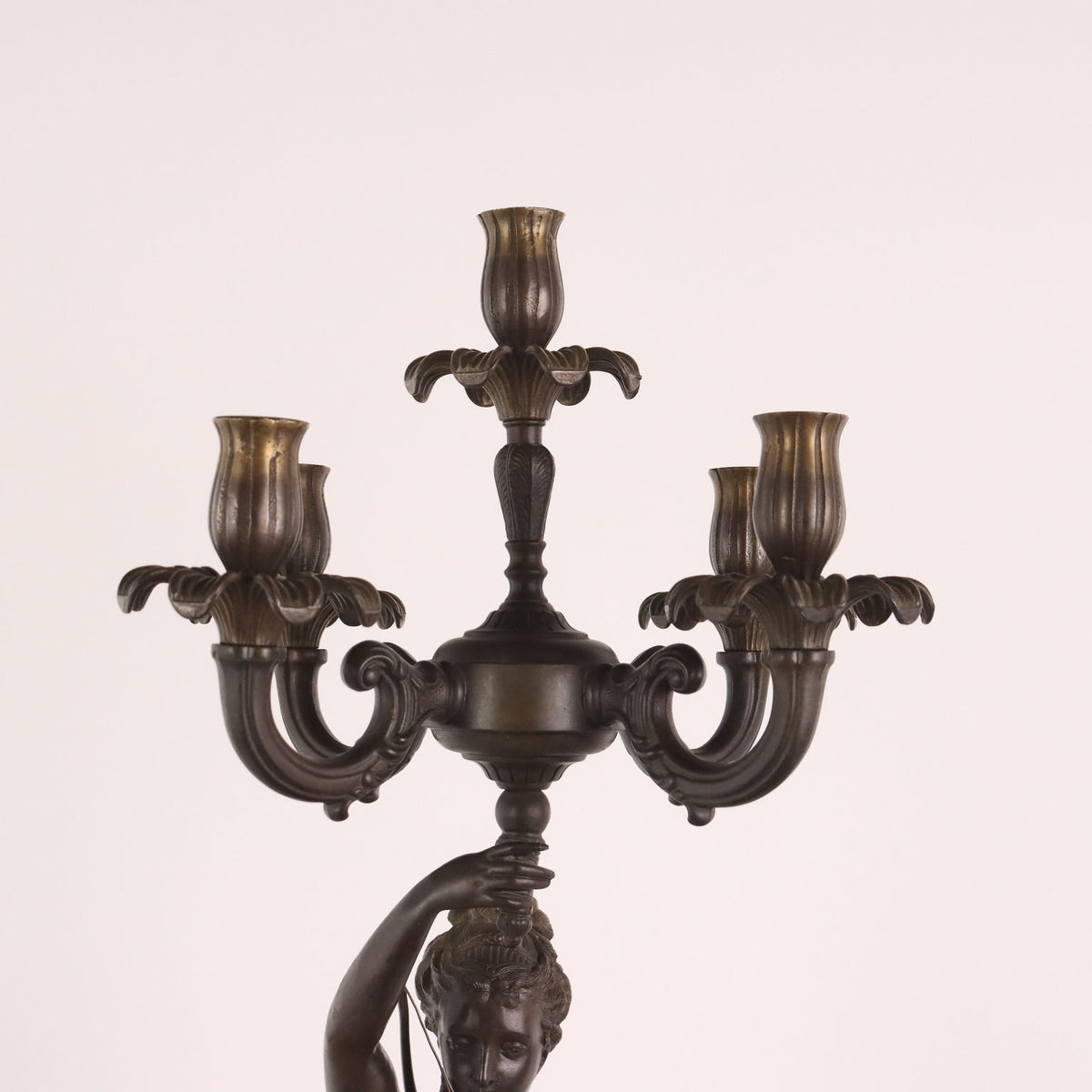 Bronze candelabra with five flames. On a circular base in black marble rests a bronze statue depicting Diana the Huntress who supports a candelabra with five flames. lampshade, 1970s table lamp, 1960s table lamp, table lamp, floor lamp, chandelier, ceiling lamp, candlestick, candle-holders, wall lamp.