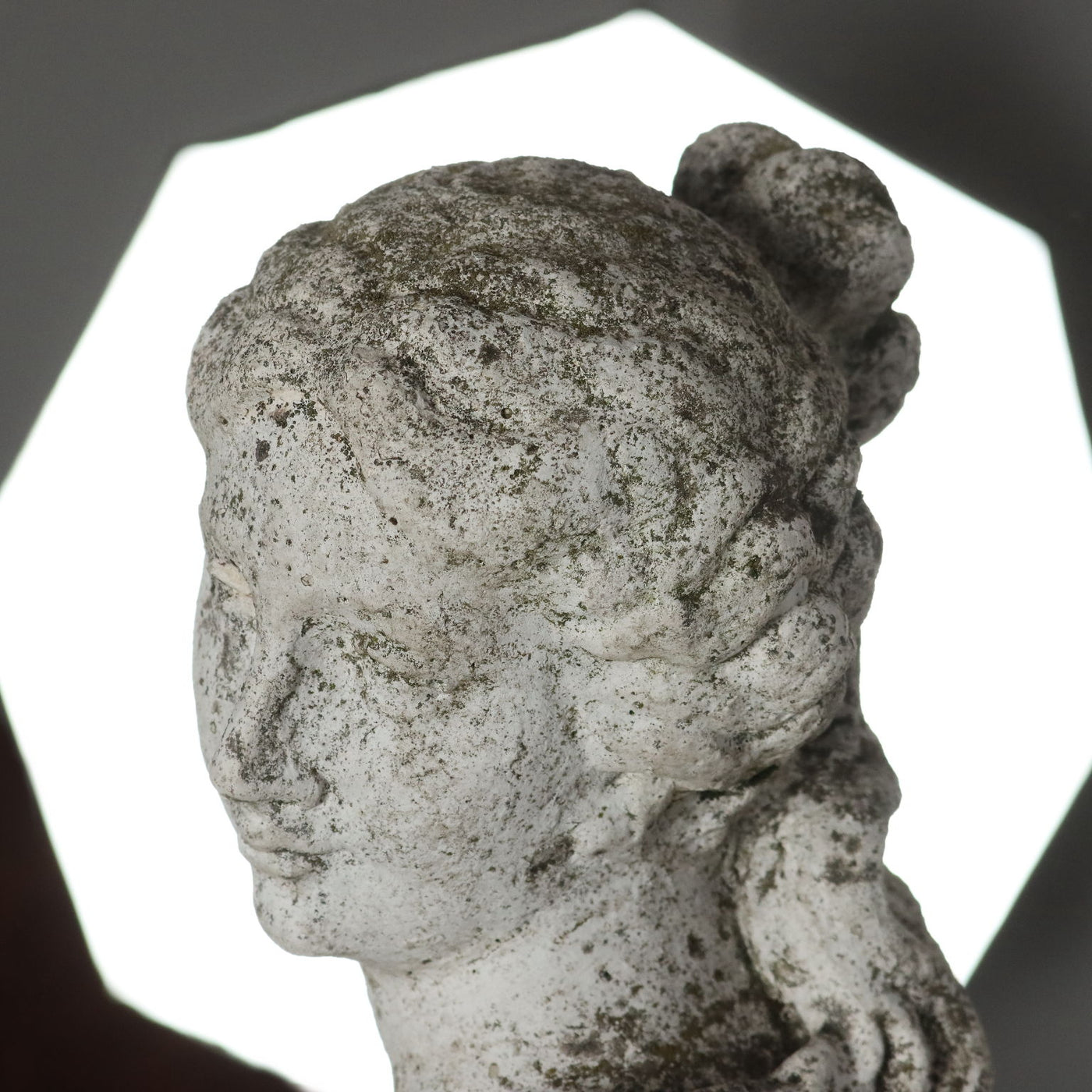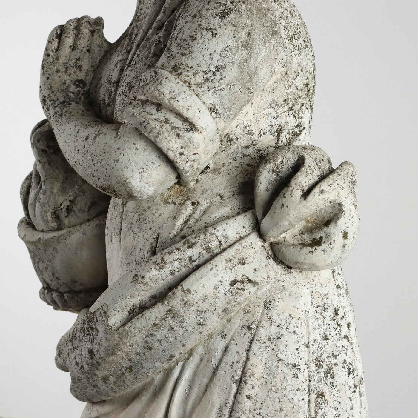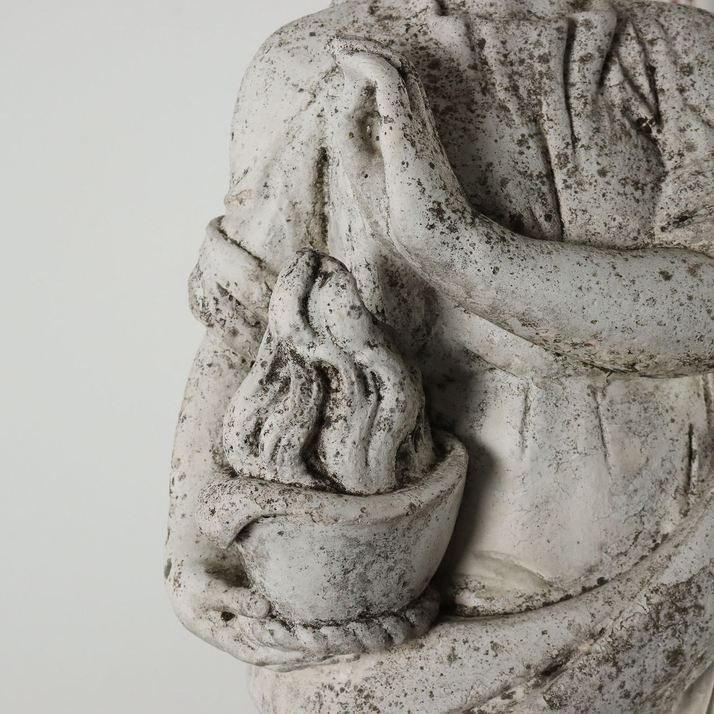 Statue made of grit in the 1900s with a base in the shape of a capital; the statue depicts a vestal holding a brazier with fire by which she warms herself, an allegory of winter. Sculptures, marble, bronzes, low-relief, relief, well-rounded, bust, sculpture, statue, ancient garden articles, , antiques furnishing, ancient supplies, garden supplies.