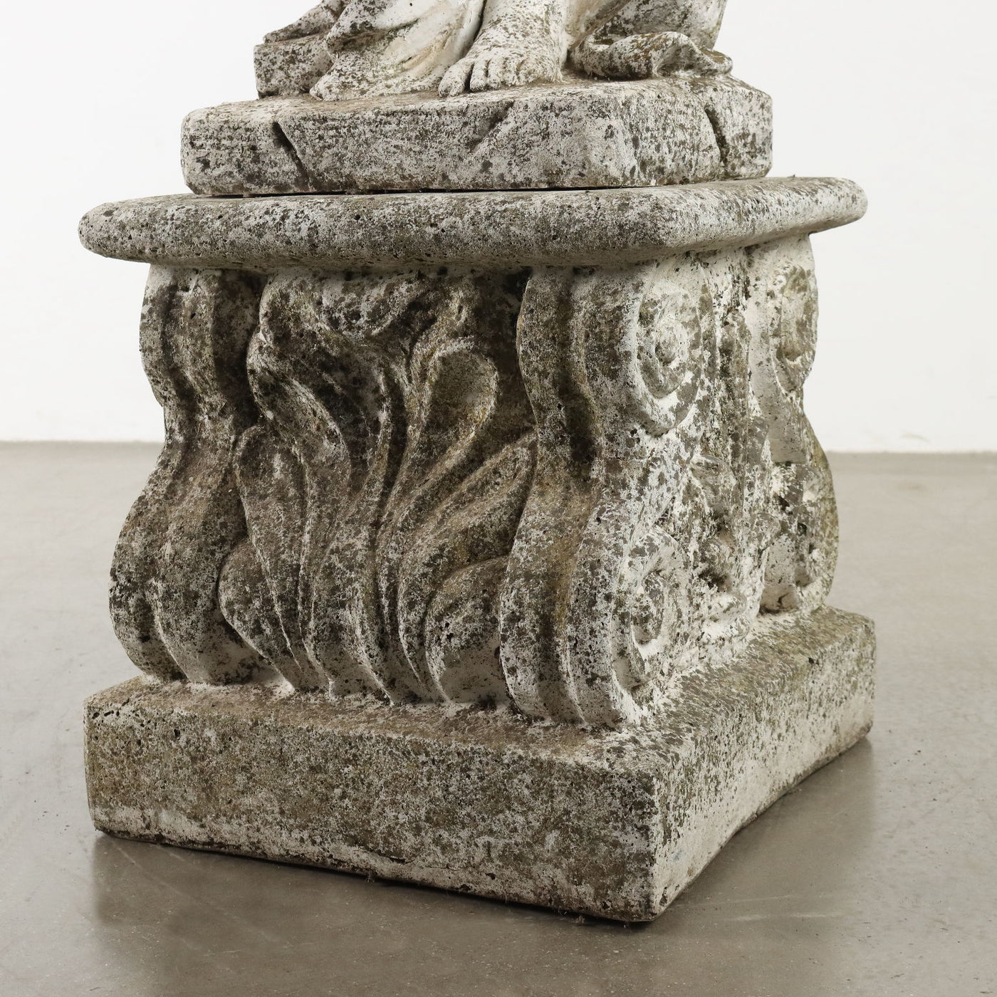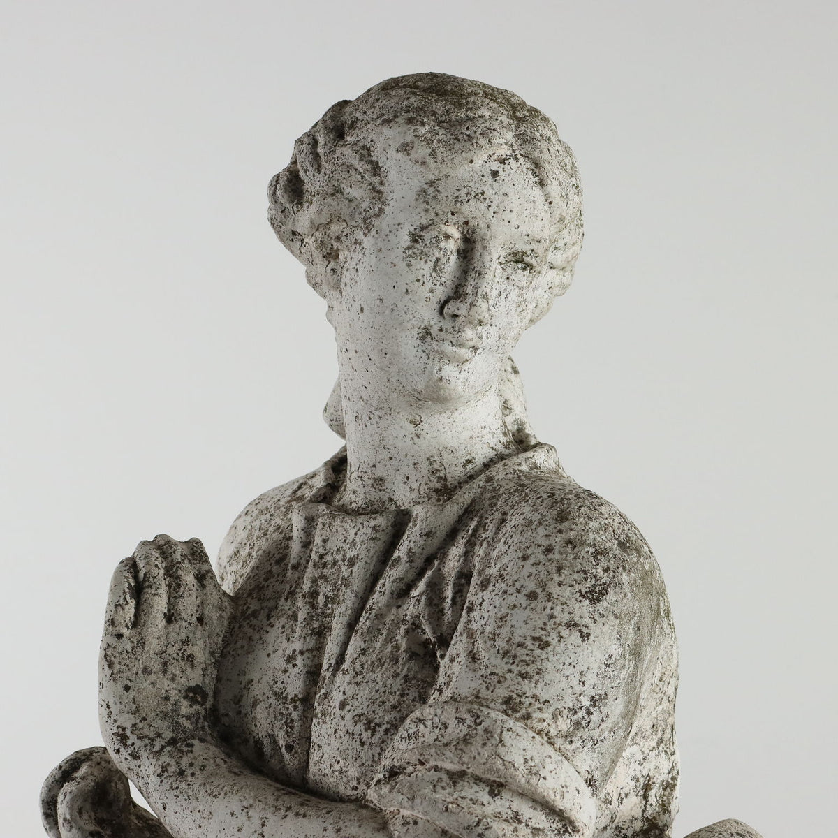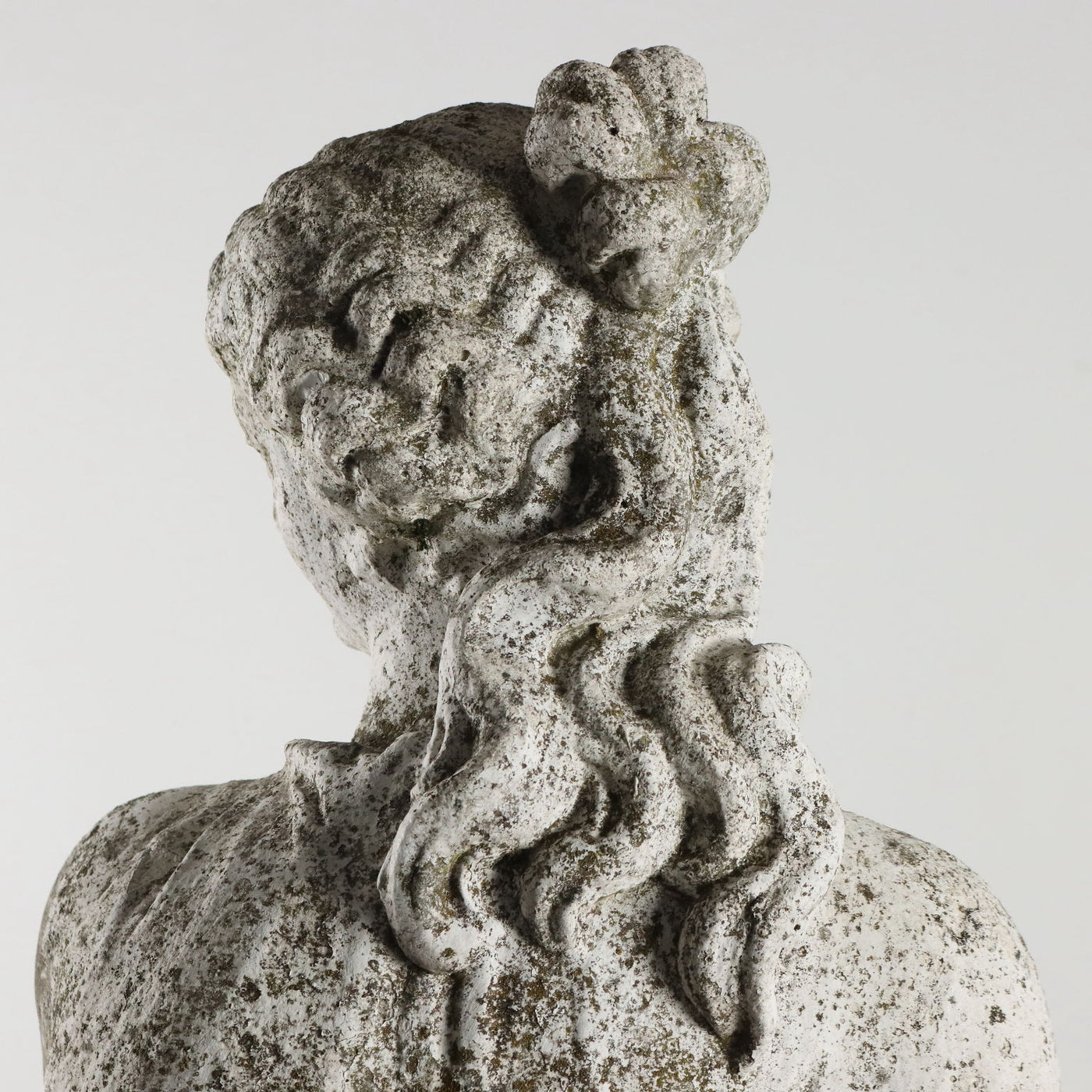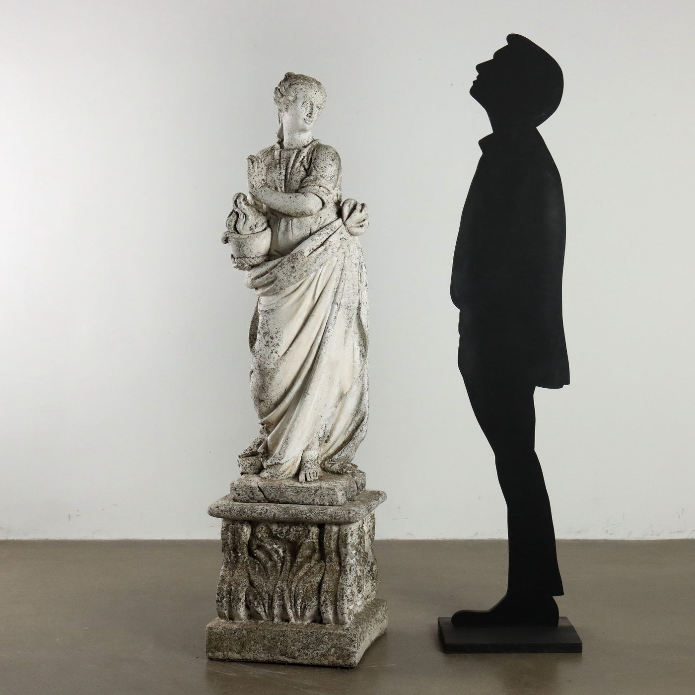 Statue made of grit in the 1900s with a base in the shape of a capital; the statue depicts a vestal holding a brazier with fire by which she warms herself, an allegory of winter. Sculptures, marble, bronzes, low-relief, relief, well-rounded, bust, sculpture, statue, ancient garden articles, , antiques furnishing, ancient supplies, garden supplies.