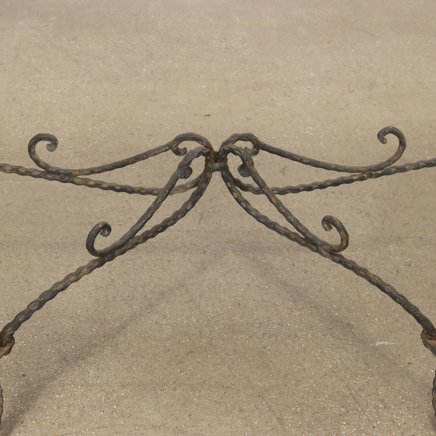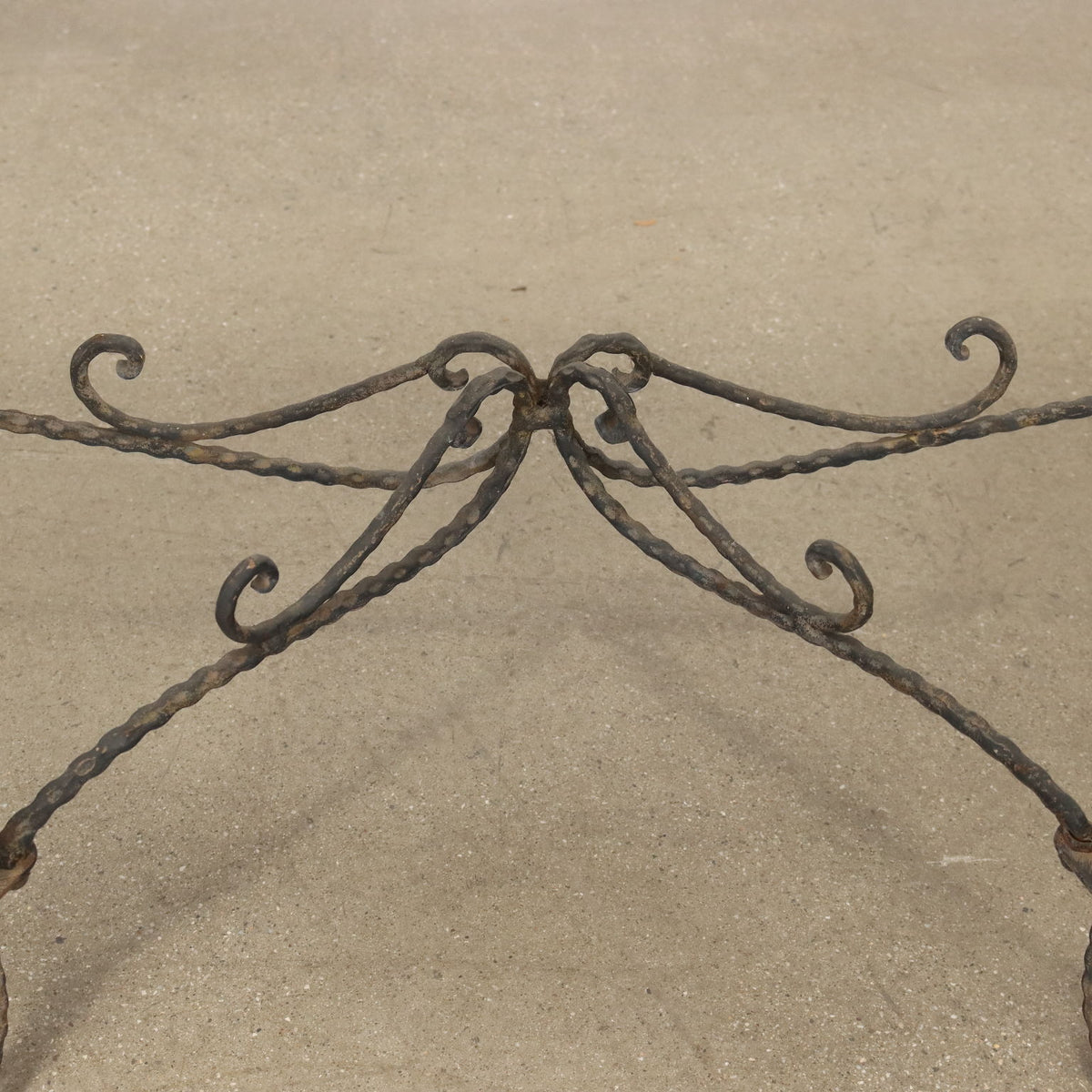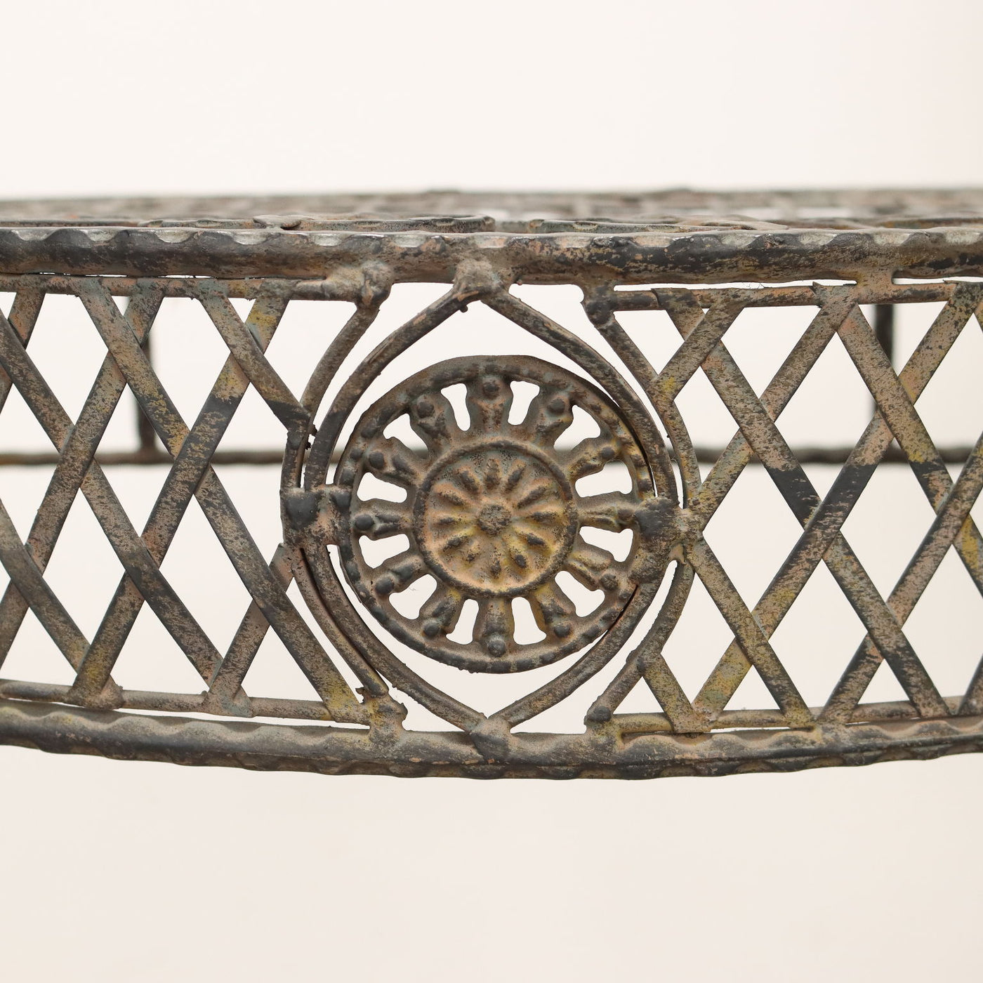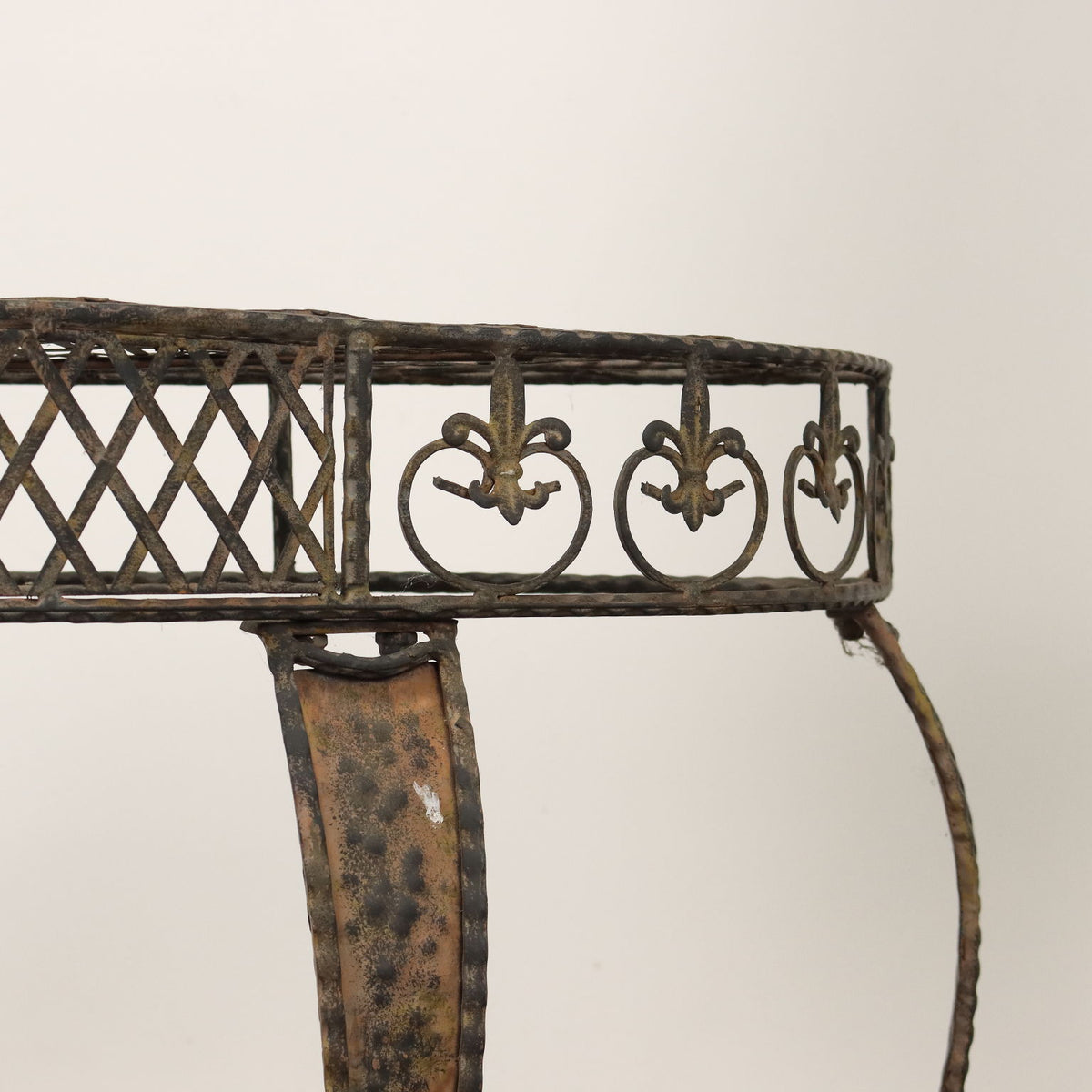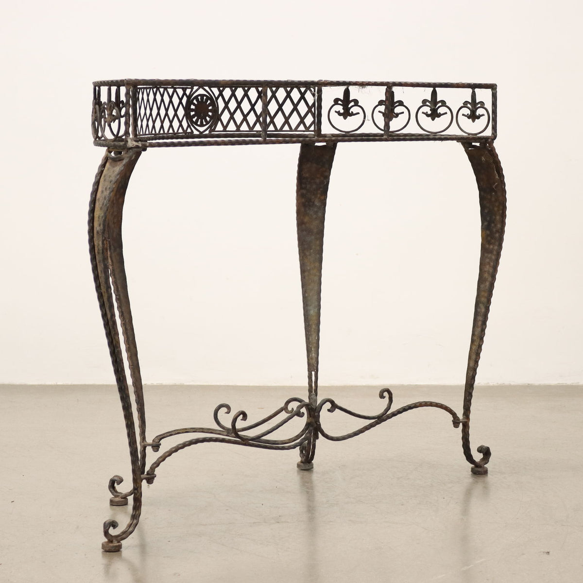 Console in iron and sheet metal worked in repoussé and painted. Top and band under the top composed of leafy and reticulated workmanship, supported by four wavy legs joined by a curly crosspiece. Ancient garden articles, , antiques furnishing, ancient supplies, garden supplies, bust.