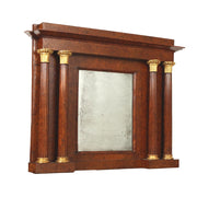 Charles X fireplace entirely veneered in elm root, Lombardy, third decade of the 19th century. Attributable to the production of Paolo Moschini, a skilled inlayer and cabinetmaker active between Soncino, his hometown, and Milan in the first half of the nineteenth century. Front with architrave and projecting plinths, connected by double columns finely fluted and embellished with gilded wooden capitals, the upper ones of which are carved with frets and acanthus leaves. Base and architrave edges threaded in amaranth, threaded column profiles in ebony. Central mercury mirror placed within the frame. Mirror, fireplace, frames, frame, small mirrors, mirror, mirrors, wall lamp.