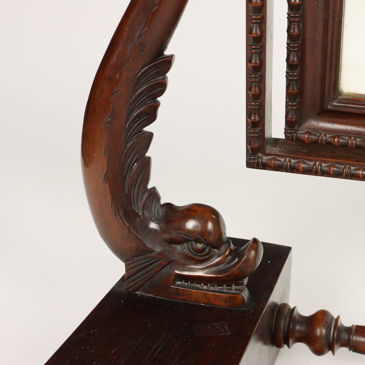 Louis Philippe cheval mirror, resting on two bases equipped with a drawer and connected by a pair of turned crosspieces; the uprights are carved in the shape of dolphins, to support the frame, decorated with a cymatium carved with leaf scrolls: the central psyche mirror has both a tilting movement and a rotation movement, thanks to a vertical pin. In mahogany, the interiors are in poplar. Mirror, fireplace, frames, frame, small mirrors, mirror, mirrors, wall lamp.