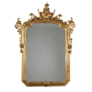 Large late 19th century living room mirror from Lombardy. Made of carved Swiss pine, the shield-shaped frame is embellished with rich carvings applied to its edges; the cymatium is carved with opposing scrolls on which branches with flowers and fruit grow, running down the sides; in the centre is the carved face of a possible Armida with a feathered crest; a small carving in the lower band. Missing parts and restorations, including two small feet added later on the base. The entire surface is gilded in gouache. Mirror, fireplace, frames, frame, small mirrors, mirror, mirrors, wall lamp.