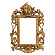 Small carved and gilded frame from the Baroque period, made in the first decades of the 18th century. The frame is carved in lime wood without applied parts; it is decorated with symmetrical leafy scrolls that end in a coat of arms at the bottom and in a shell on the top, on which a winged cupid flies down, bringing a crown to the figure depicted in the portrait, probably a bride metaphorically represented as Venus, according to the typical attributes, shell and Cupid. The similarity with the more famous frame attributed to Parodi, in which the narration of the Judgement of Paris is depicted, is evident: the moulding of the frame is the same as the two putti placed in the shell, in that case placed at the base of the frame, seem very close, a detail that makes us think of a production by a student of the same workshop. Mirror, fireplace, frames, frame, small mirrors, mirror, mirrors, wall lamp.