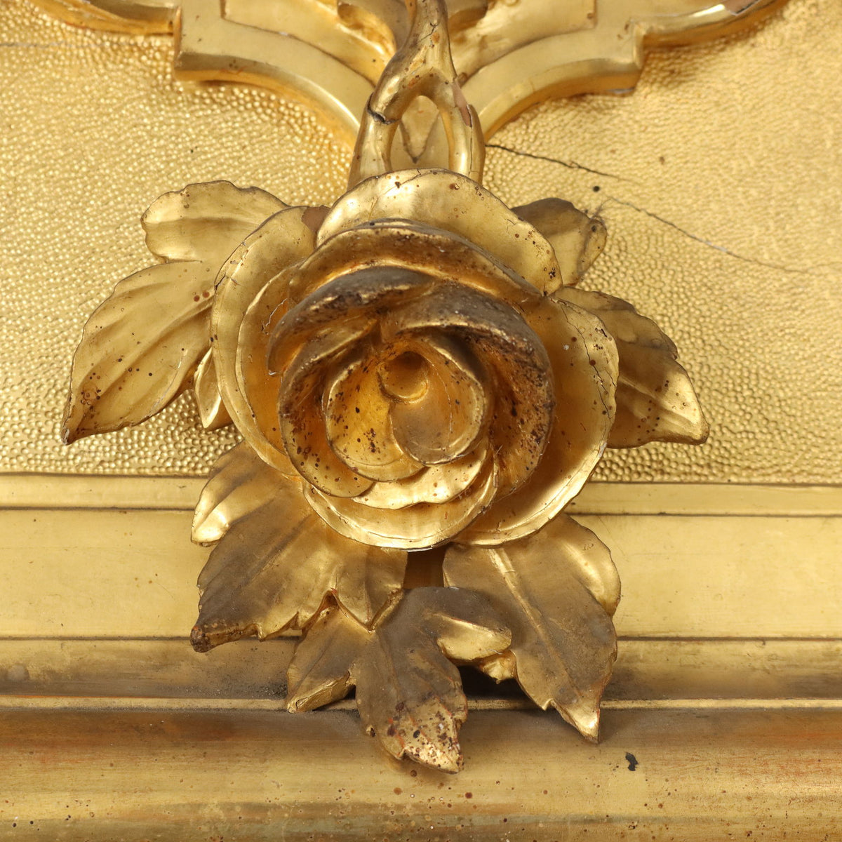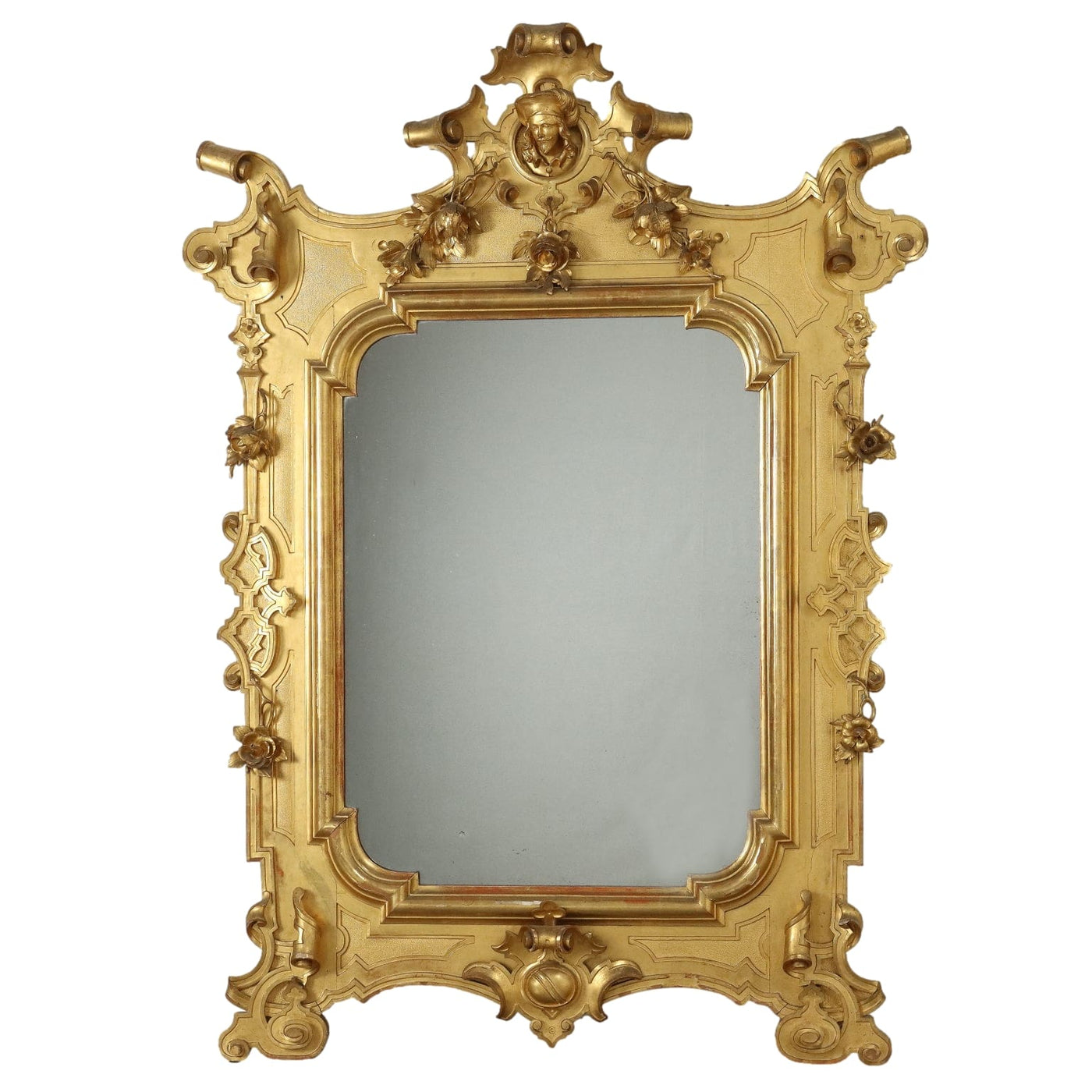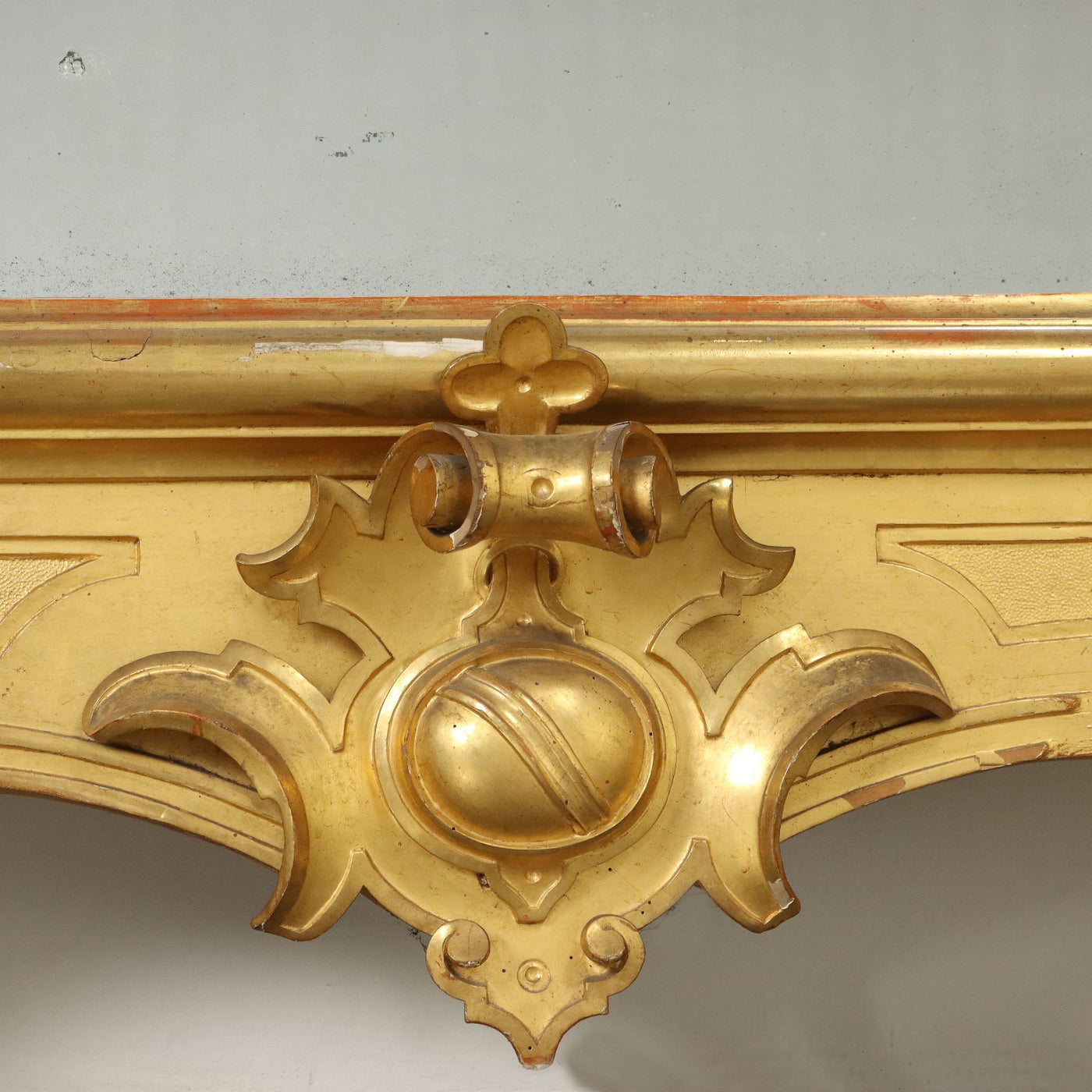 Large mirror from the Umbertine period. Carved with large scrolls, curls and overlapping lambrequins, in the cymatium medallion with a knight's head and carved rose branches, mercury mirror, the entire surface is gilded in gouache. Mirror, fireplace, frames, frame, small mirrors, mirror, mirrors, wall lamp.