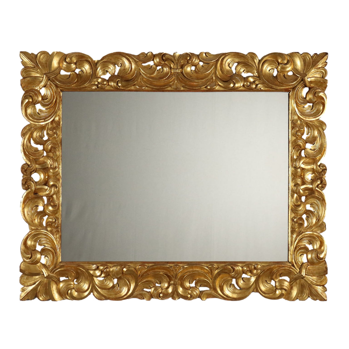Baroque style mirror, in carved wood with leaf motifs, scrolls and ribbons, and gilded. Italy, 19th century. Mirror, fireplace, frames, frame, small mirrors, mirror, mirrors, wall lamp.