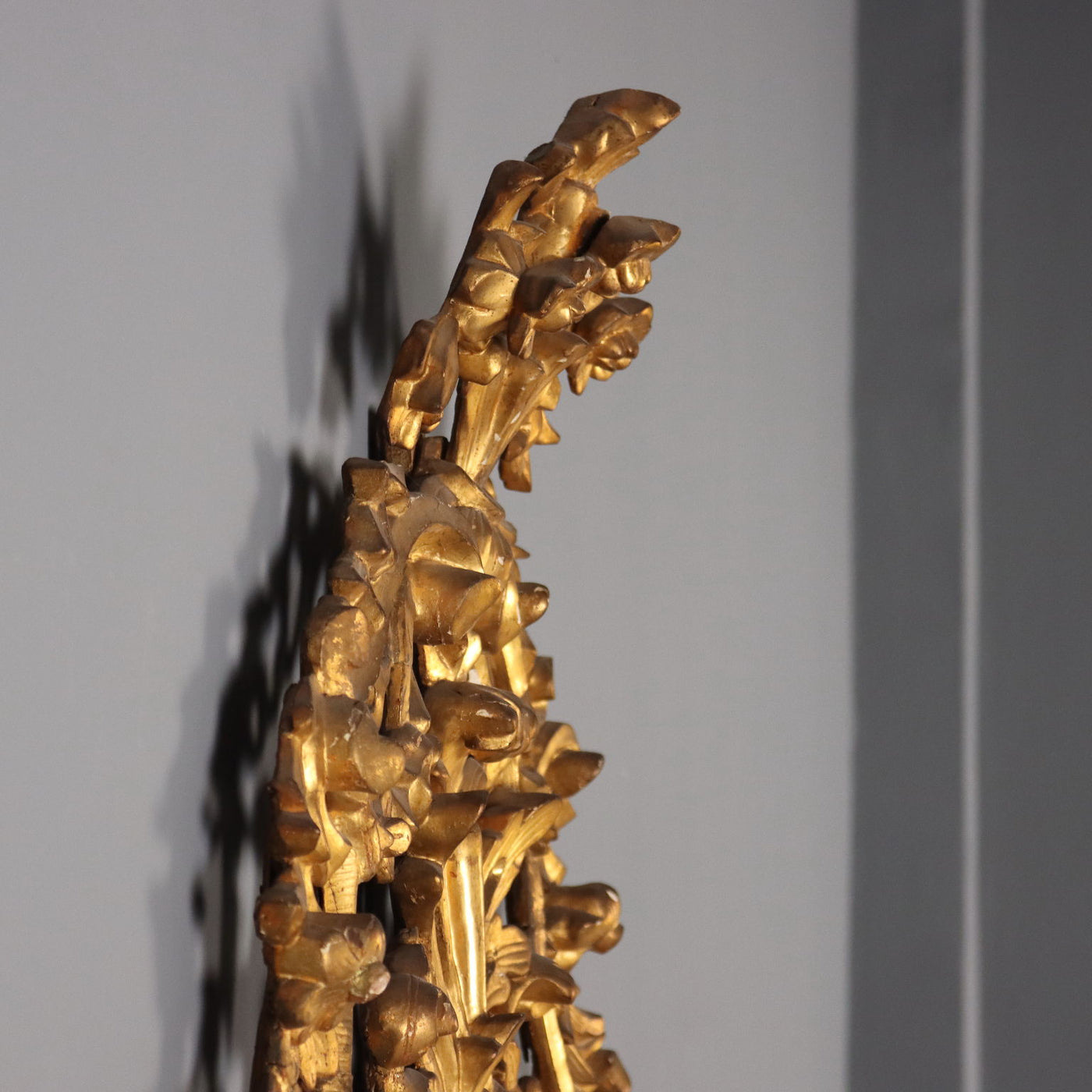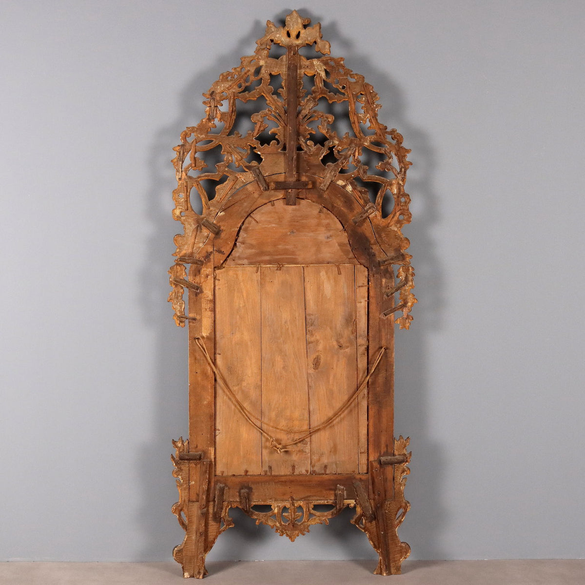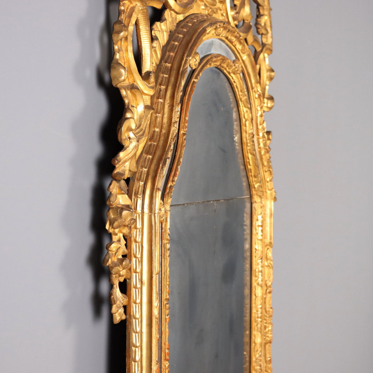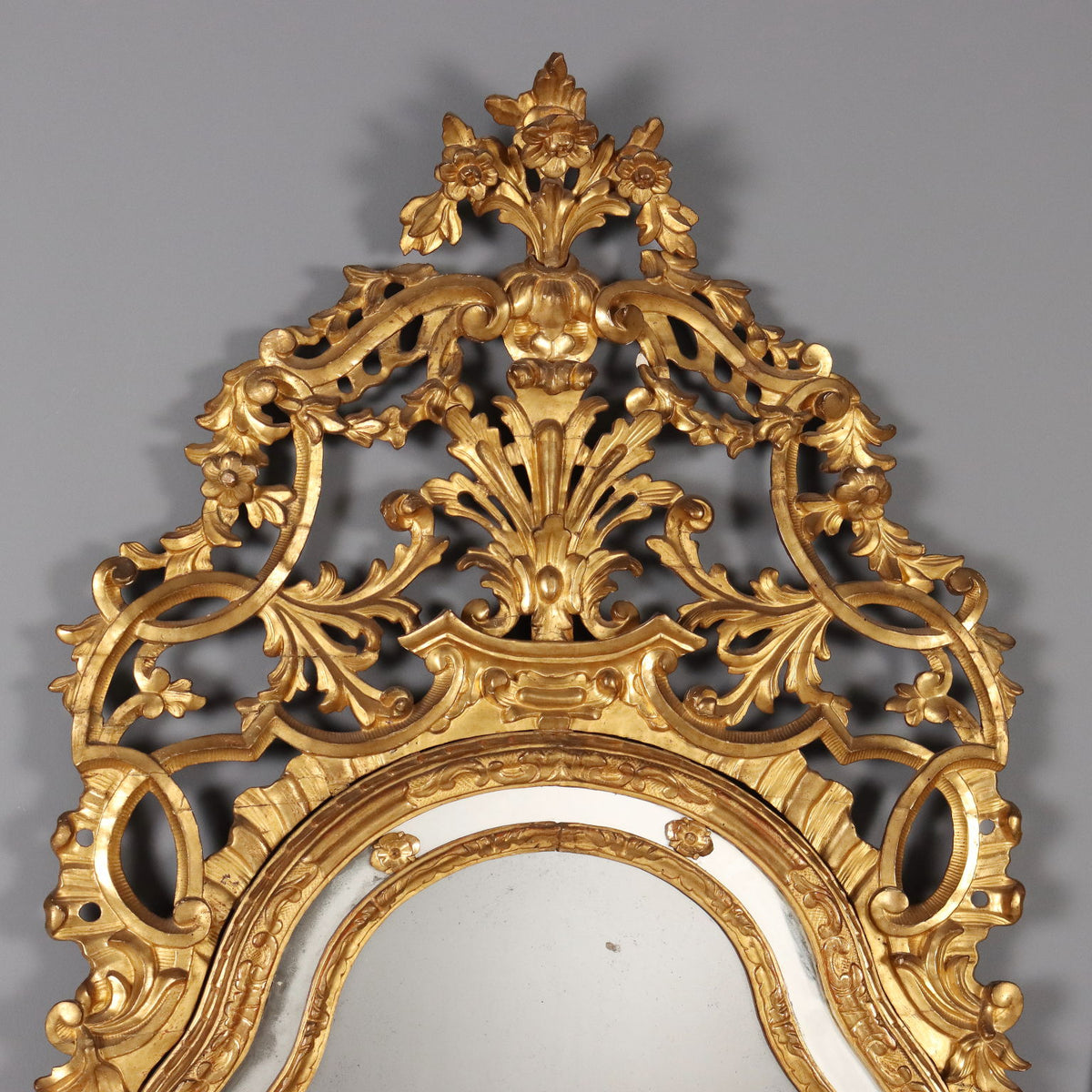 Carved and gilded wooden mirror. Central mirror in two parts, enclosed in a double carved wooden frame, interposed by a mirror profile with wooden carved flower inserts. Richly carved openwork cymatium, floral and leaf carvings, support feet carved with volutes and festoons, and floral waste on the sides. Antonetto Roberto publication “Il mobile piemontese del settecento”, Allemandi edition 2010. Piedmont, late 18th century. Mirror, fireplace, frames, frame, small mirrors, mirror, mirrors, wall lamp.
