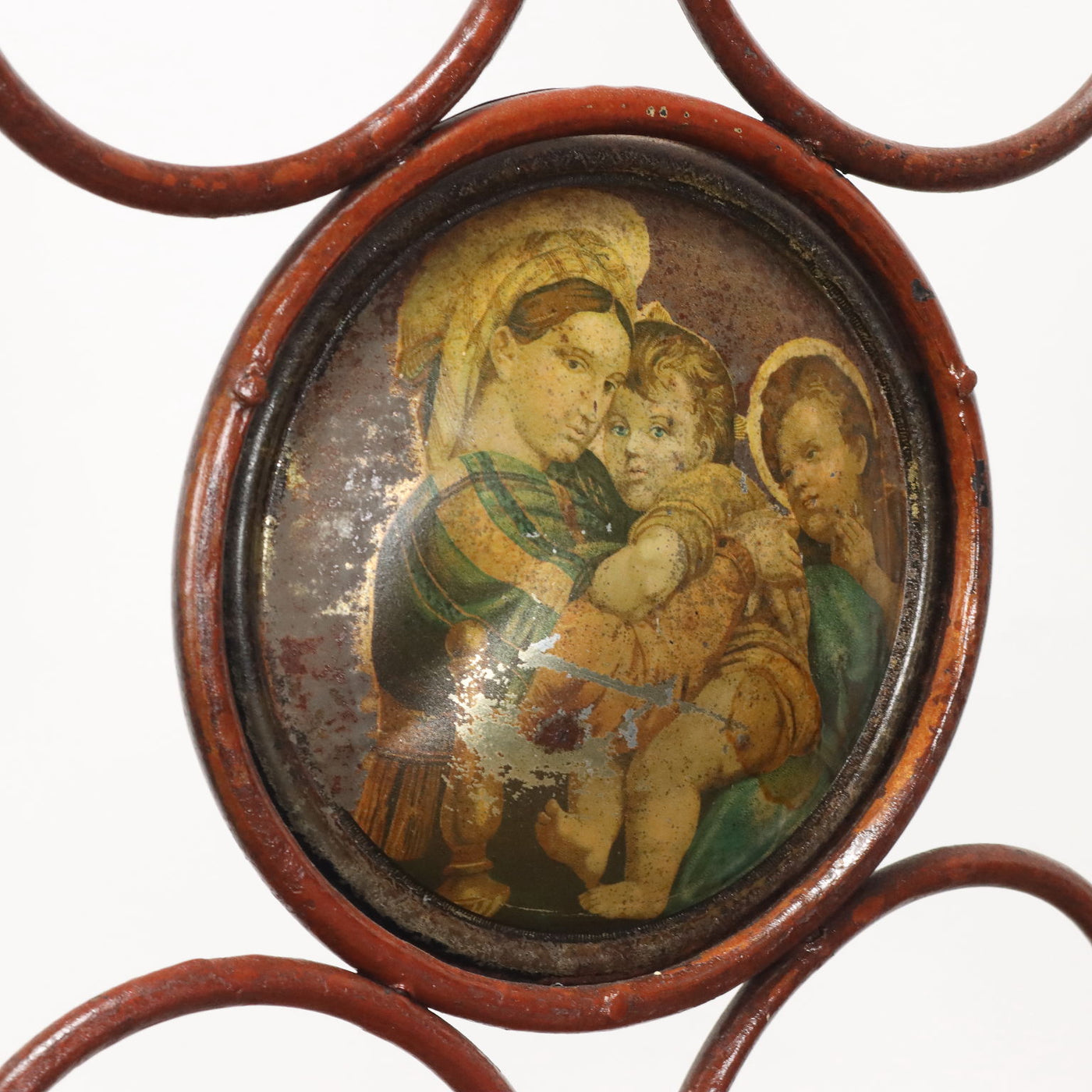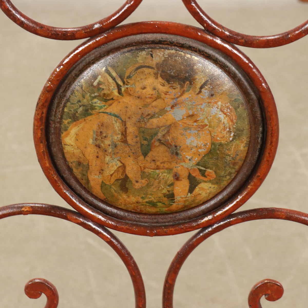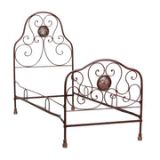 Wrought iron bed made in the mid-19th century, decorated with curled scrolls made of iron on the headboard and footboard with metal medallions in the centre painted with Raphaelesque subjects. Beds and Headboards, , keyboard, bed, cradle, cot.