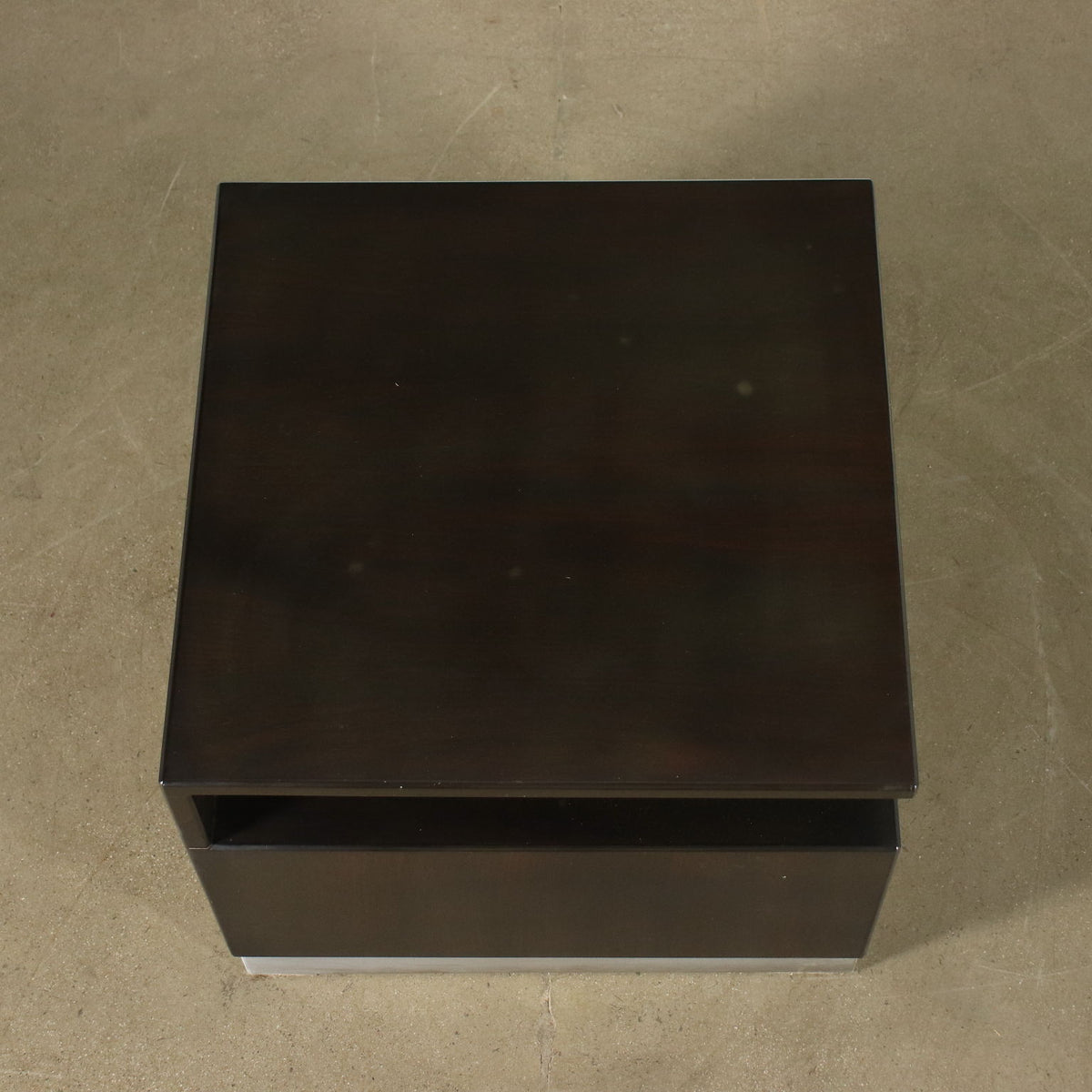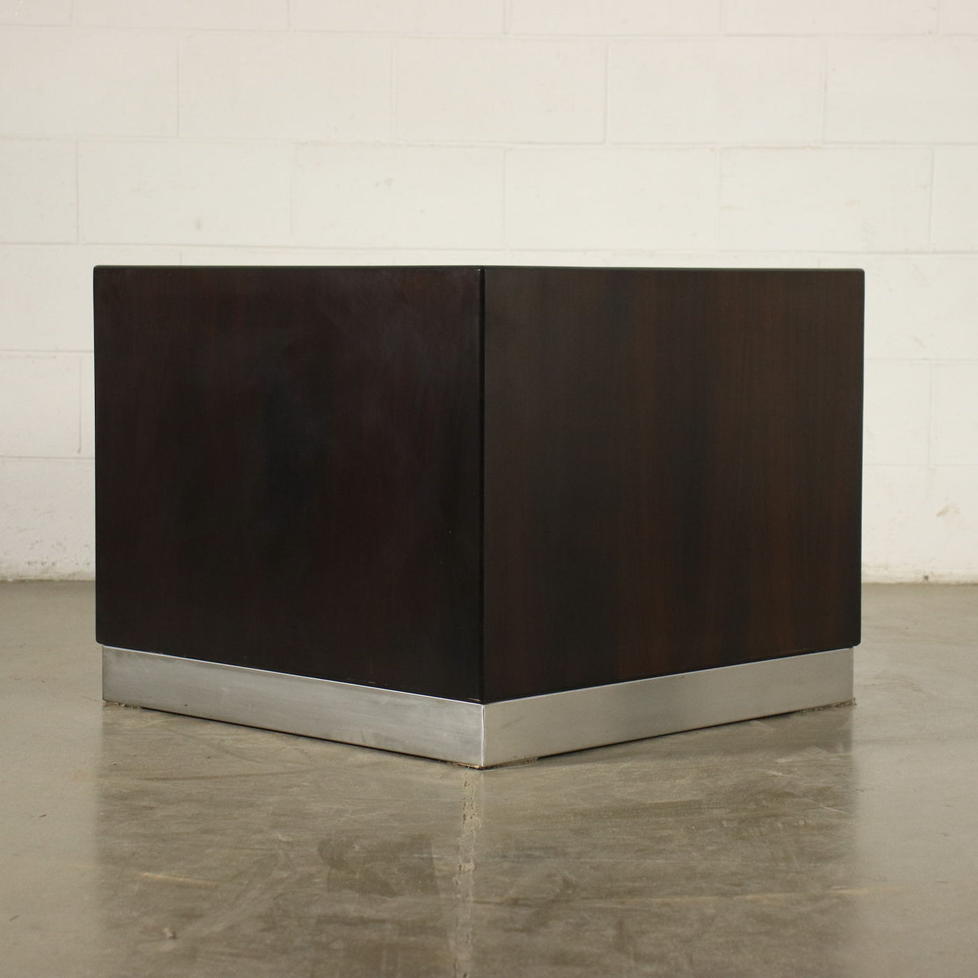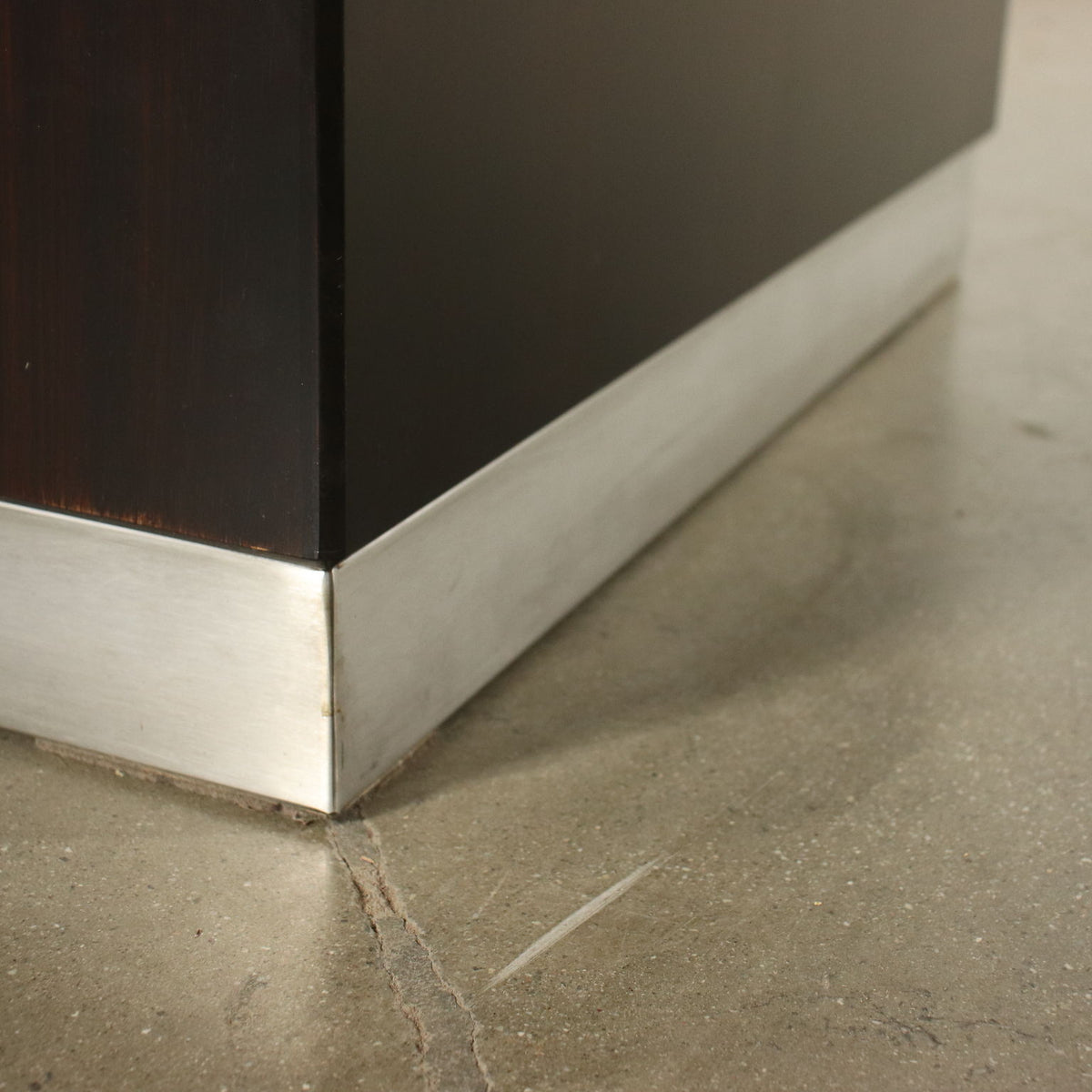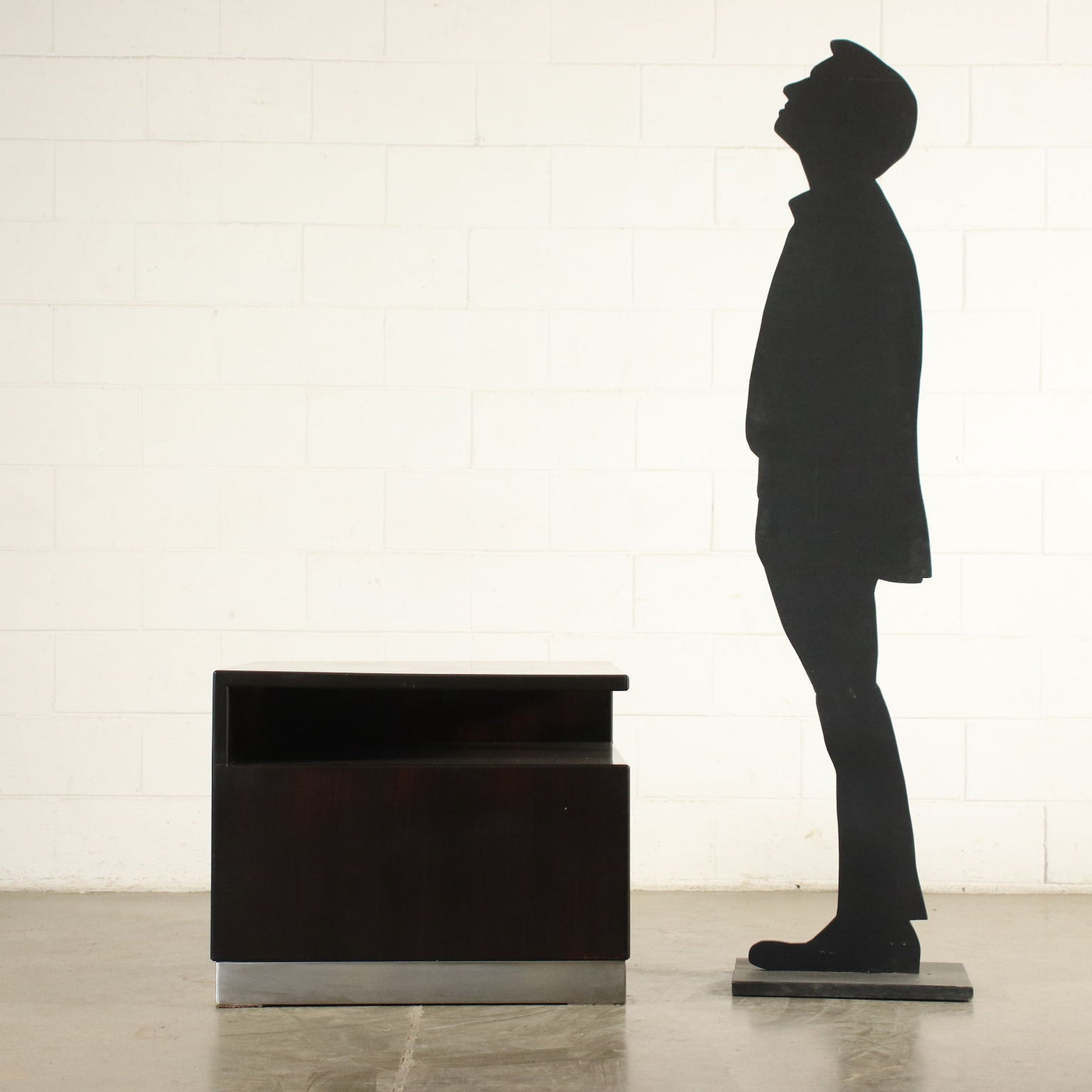 Corner cabinet, veneered wood, chromed aluminum band. oriental carpets, mirror.