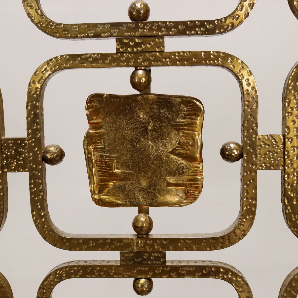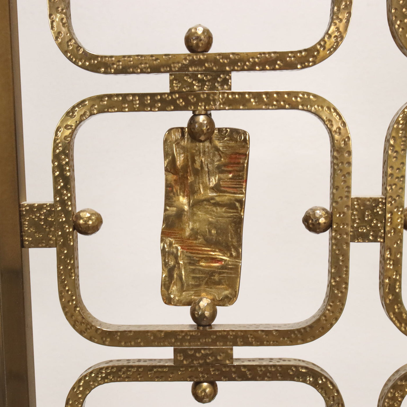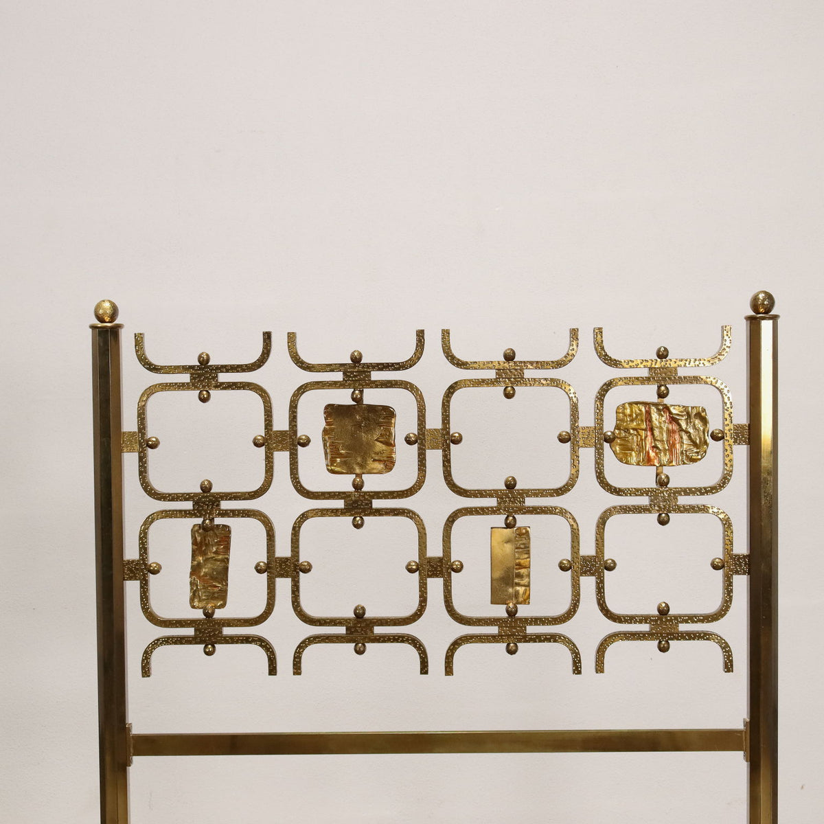 Pair of beds with brass structure, headboard with worked brass panels. 1950s bed, design bed, oriental carpets, mirror.