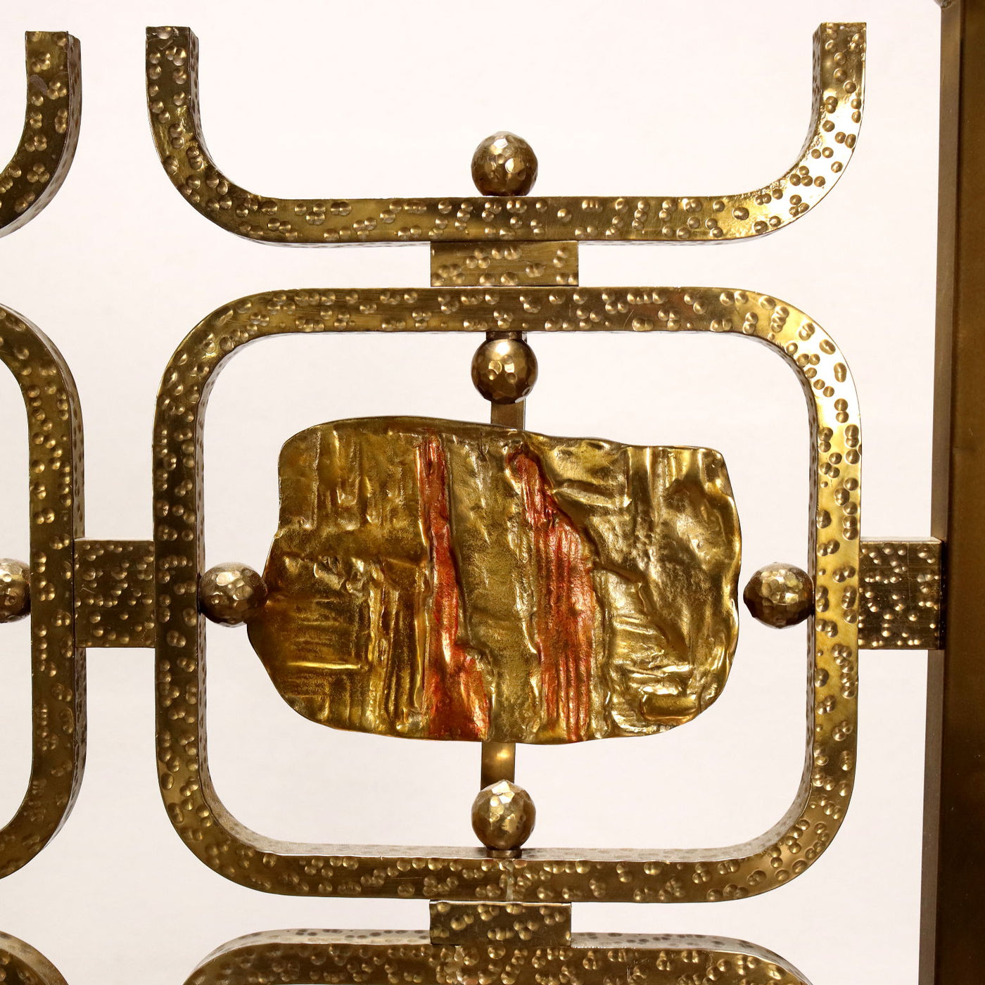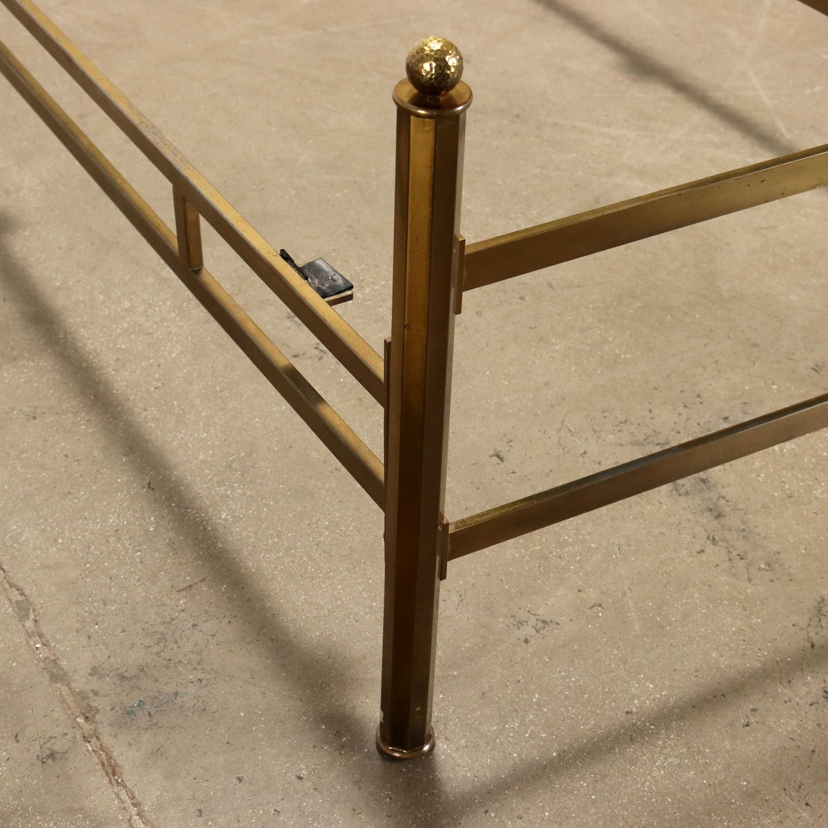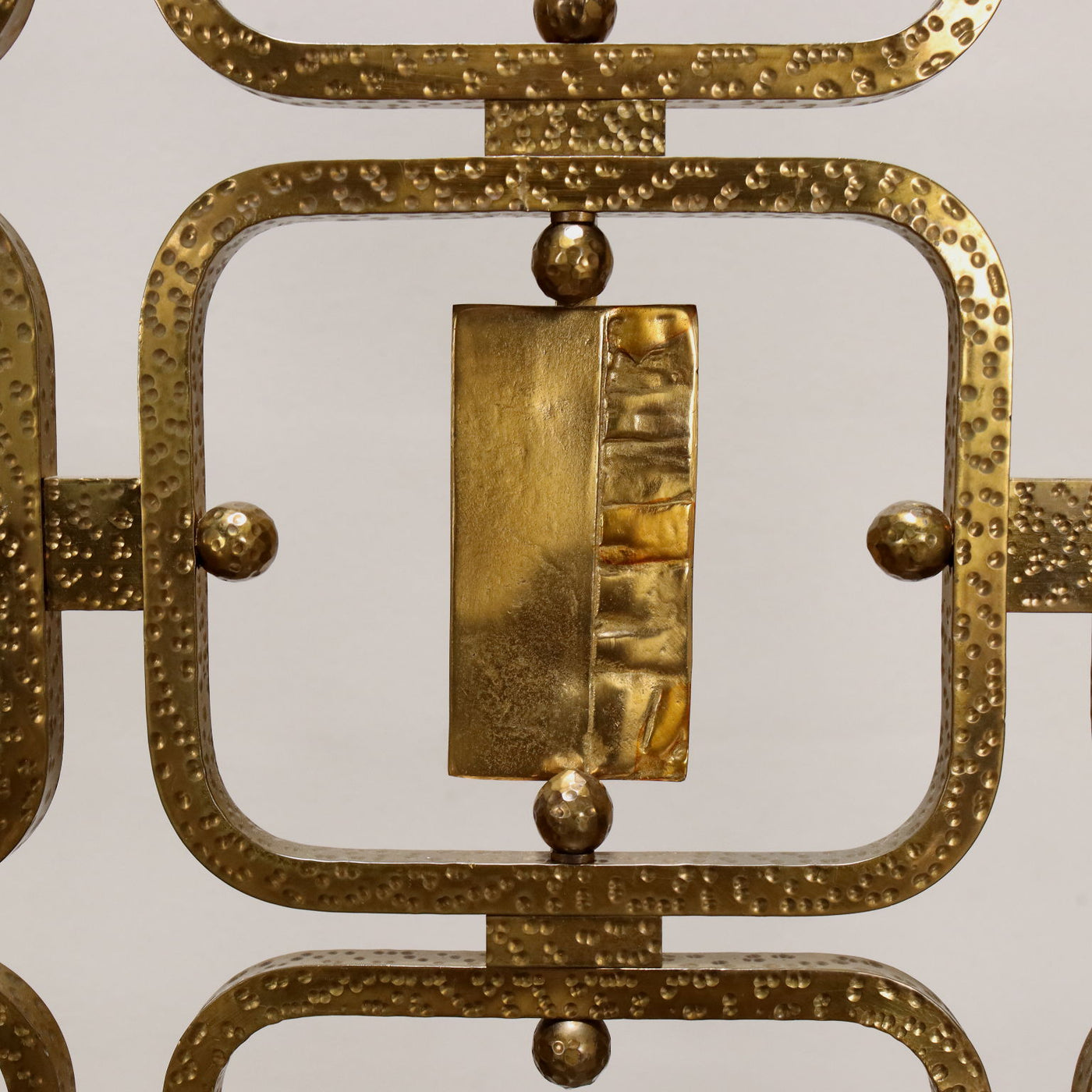 Pair of beds with brass structure, headboard with worked brass panels. 1950s bed, design bed, oriental carpets, mirror.