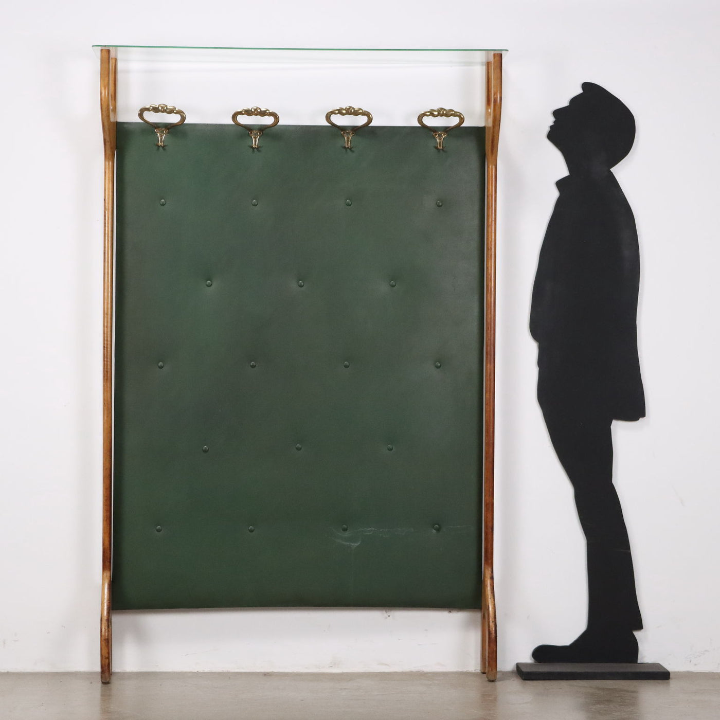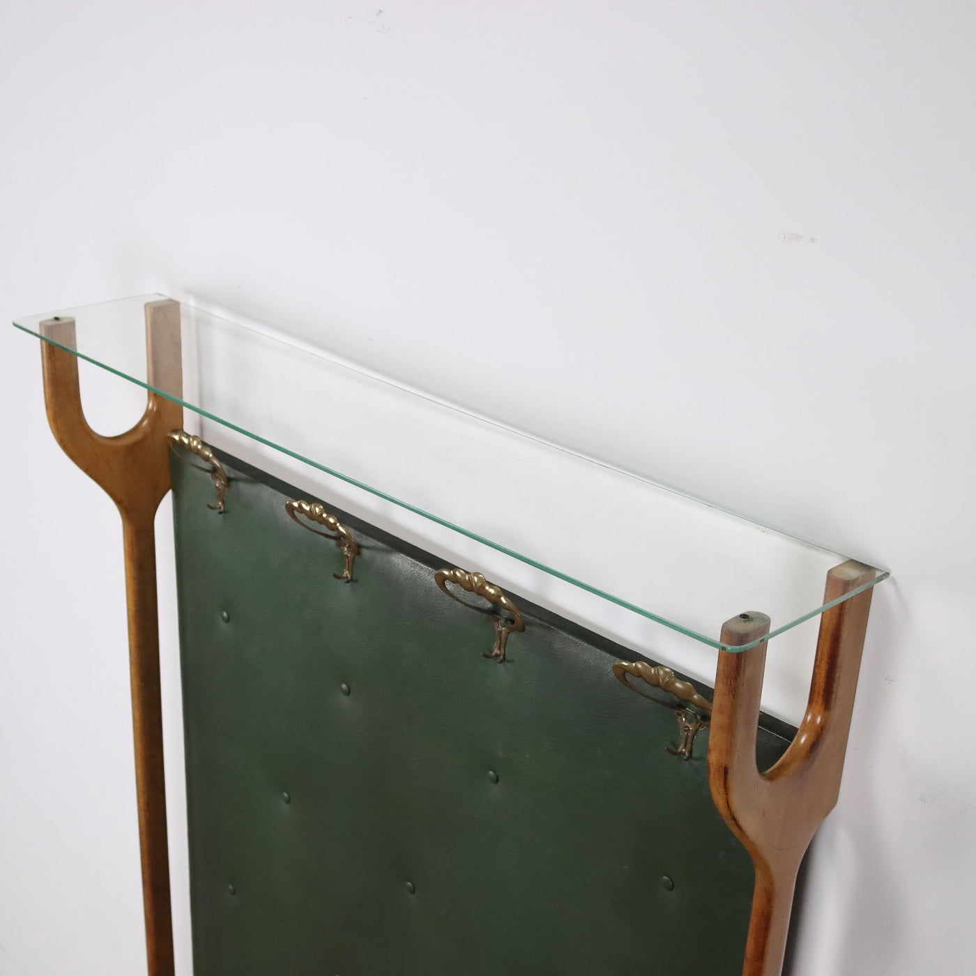 Wall coat stand in beech wood, skai covering, brass and glass shelf. oriental carpets, mirror.