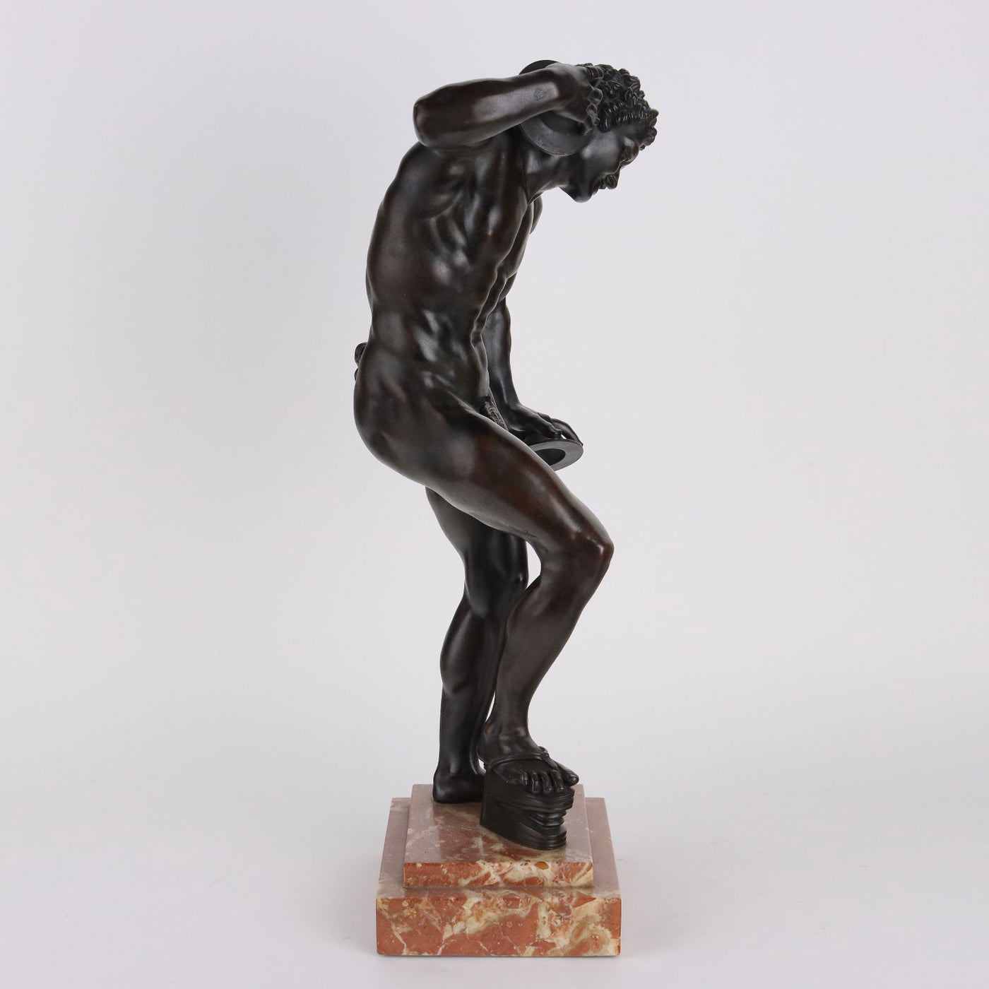 Bronze sculpture depicting a faun with cymbals on a red marble base. bronzes, low-relief, relief, well-rounded, bust, sculpture, statue.