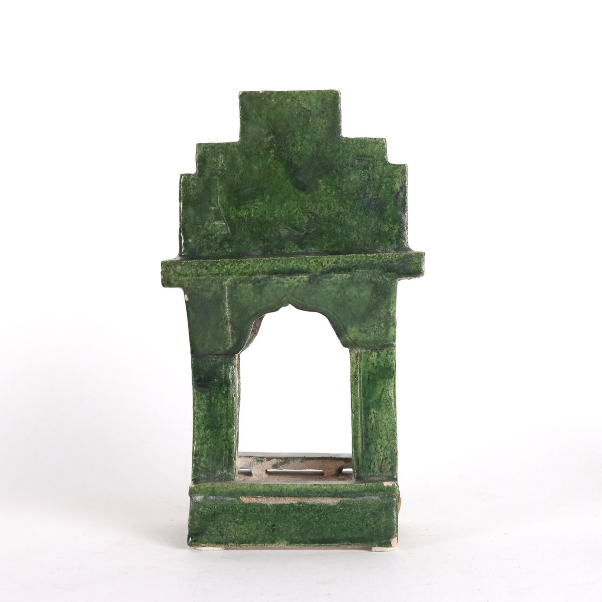 Green glazed ceramic throne model modeled and engraved according to the refined canons of the time. vases, service, plates, small sculptures, terracotta, porcelain, majolica, earthenware, ceramics, collector's articles, ancient objects.
