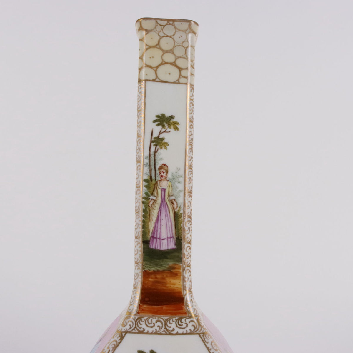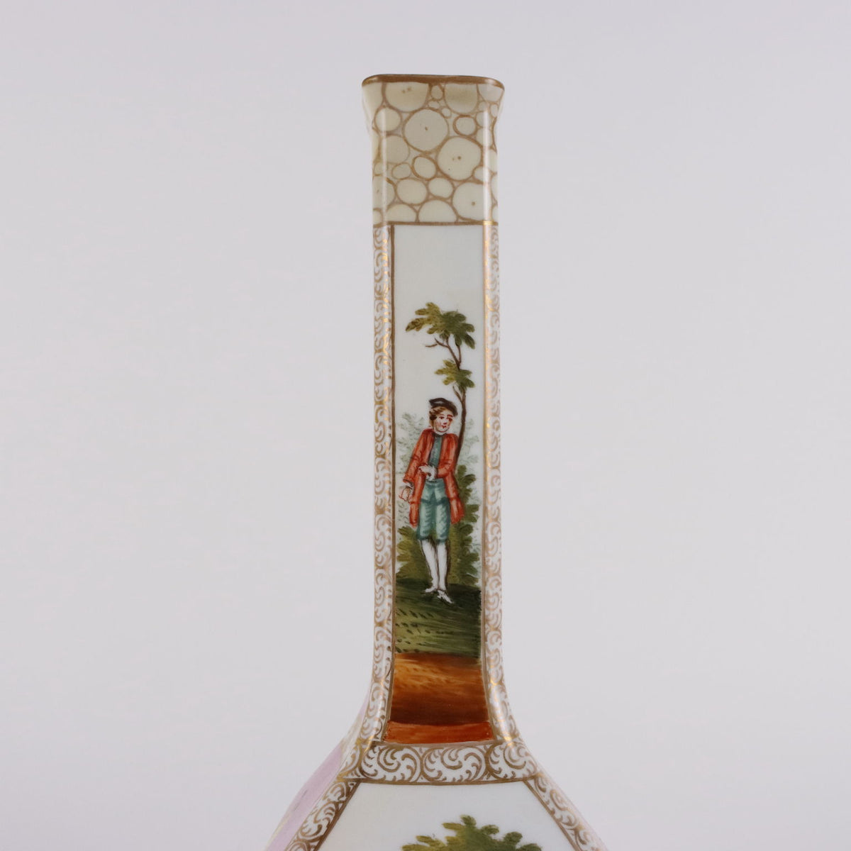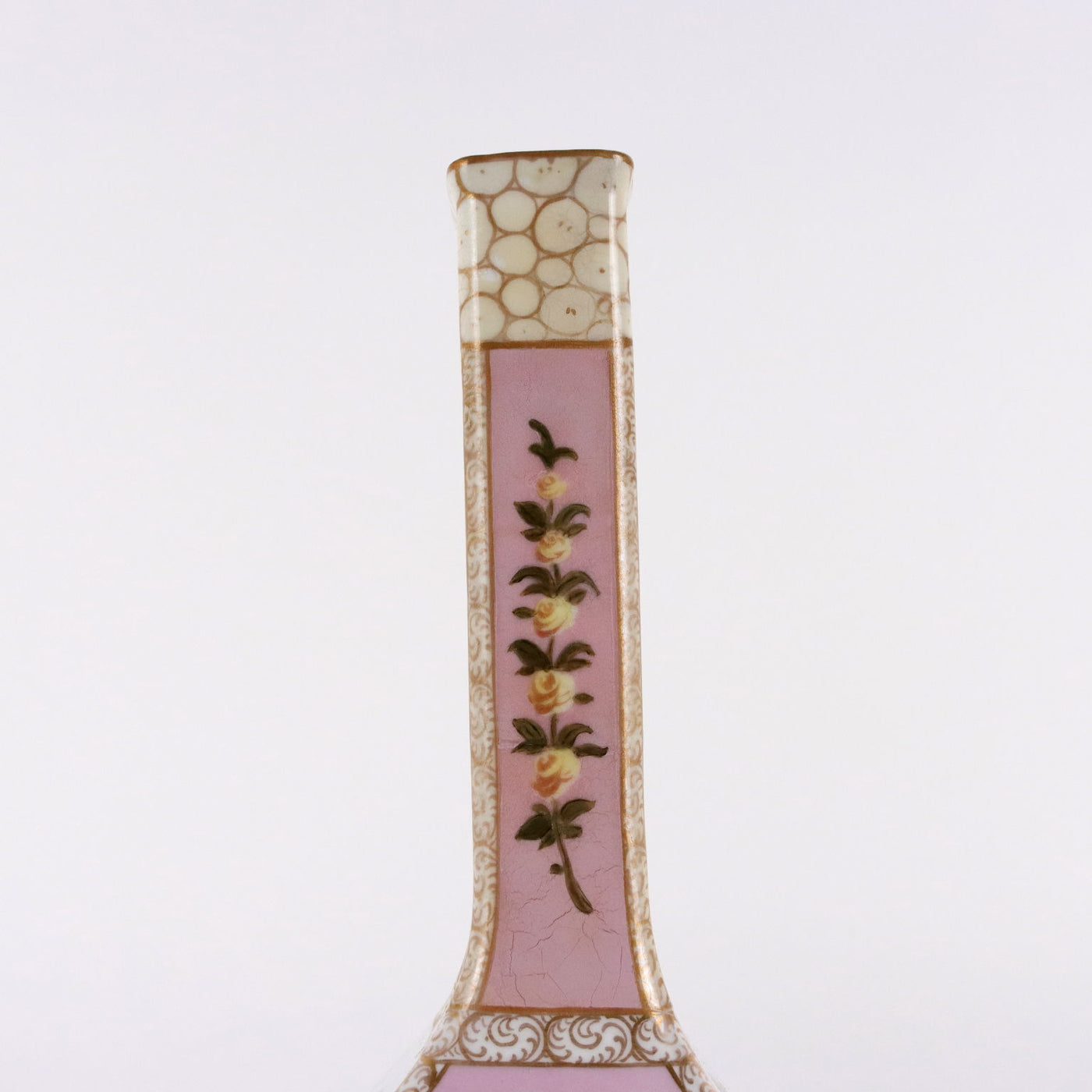 Pair of square section porcelain vases with narrow and elongated neck. Decorations with bunches of flowers inside reserves alternating with amorous scenes and figures. Maker's mark under the base. collector's articles, ancient objects, porcelain, ceramics.