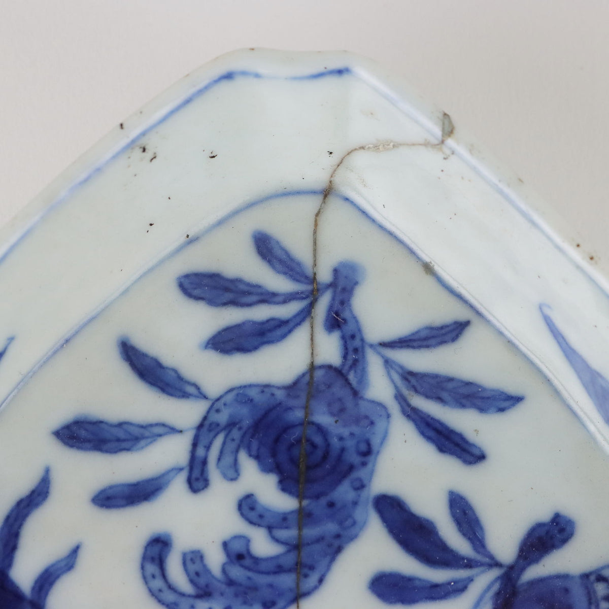 Small Chinese polylobed ko sometsuke saucer with triangular plan, decorated in blue underneath with a peach, a pomegranate, a lemon 'Citrus medica' also known as Buddha's hand and an ideogram symbol of longevity. Three bats decorate its brim. collector's articles, ancient objects, porcelain, ceramics.