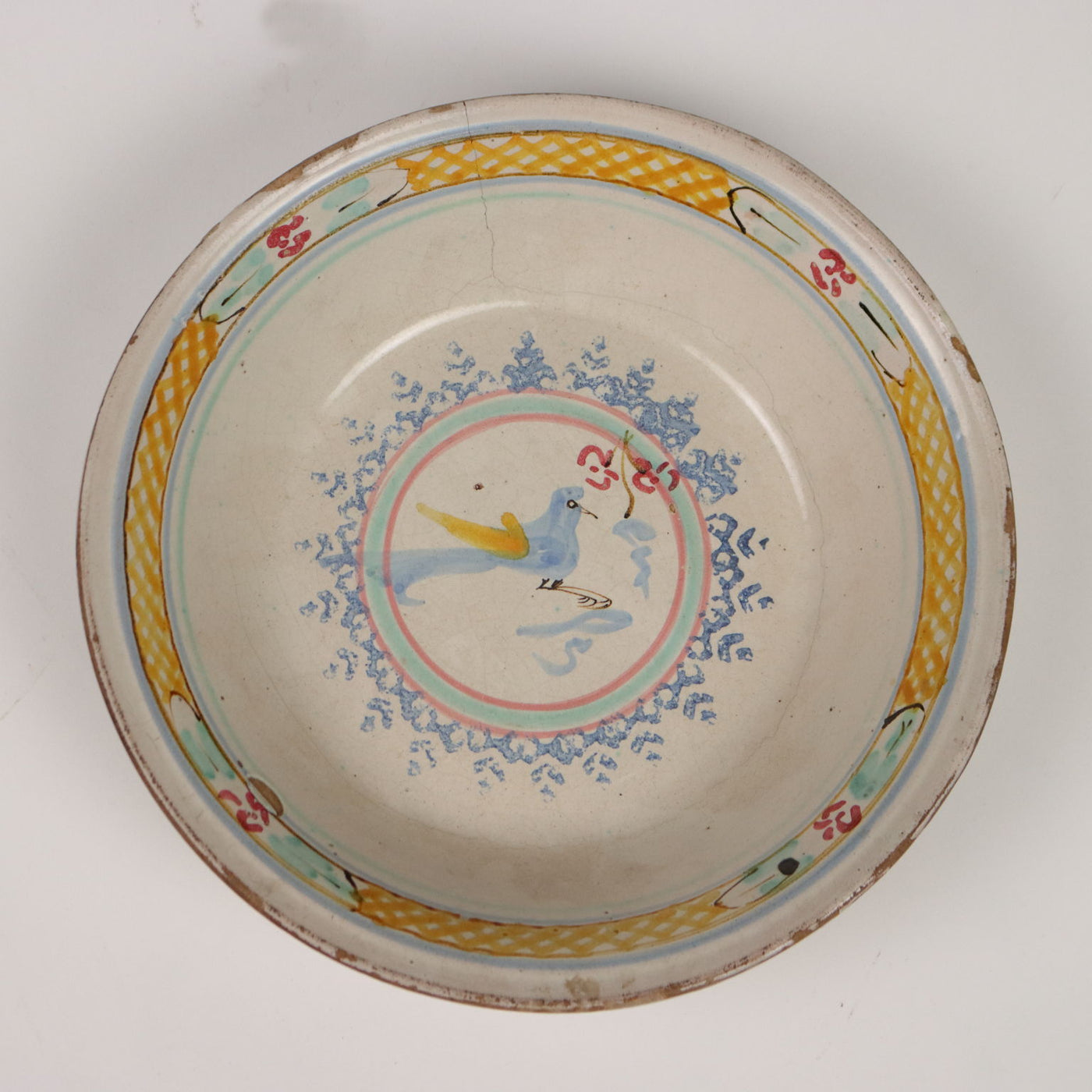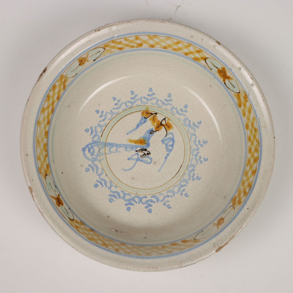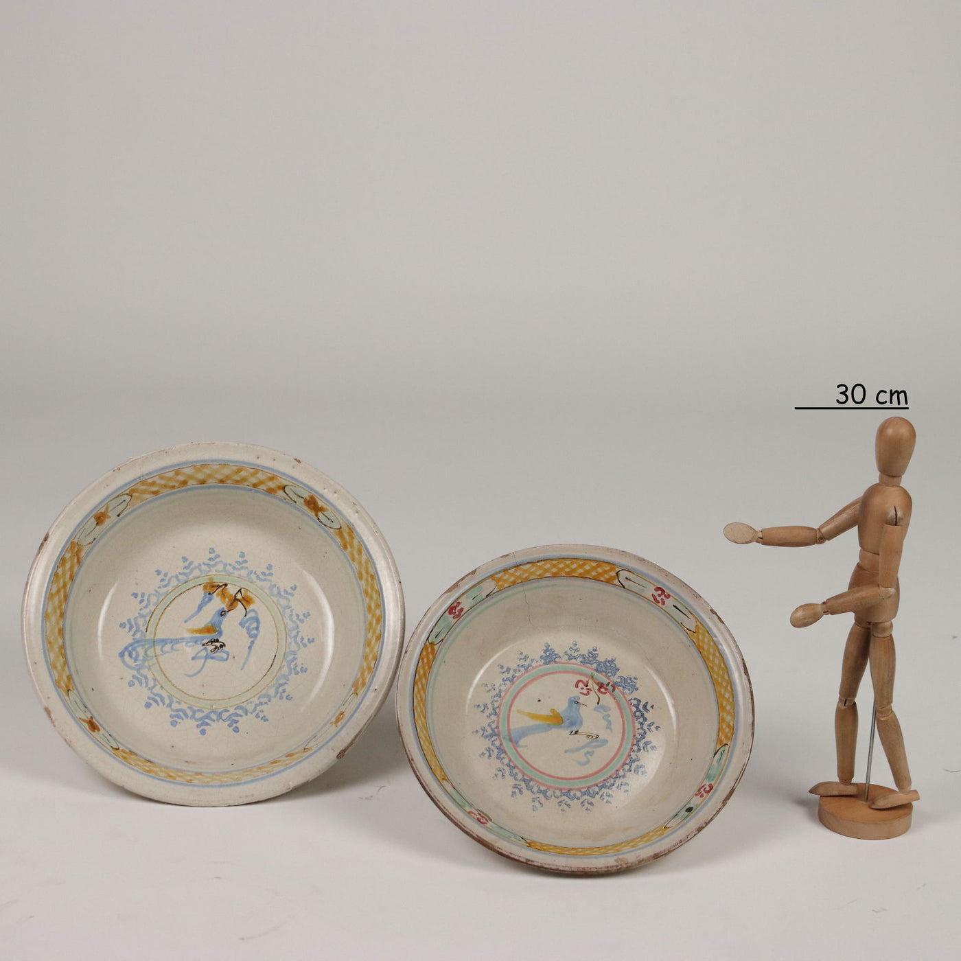 Group of three majolica bowls. On the brim polychrome decoration with geometric pattern; at the bottom of the bird cave there is a typical decoration of the manufacture. vases, service, plates, small sculptures, terracotta, porcelain, majolica, earthenware, ceramics, collector's articles, ancient objects.