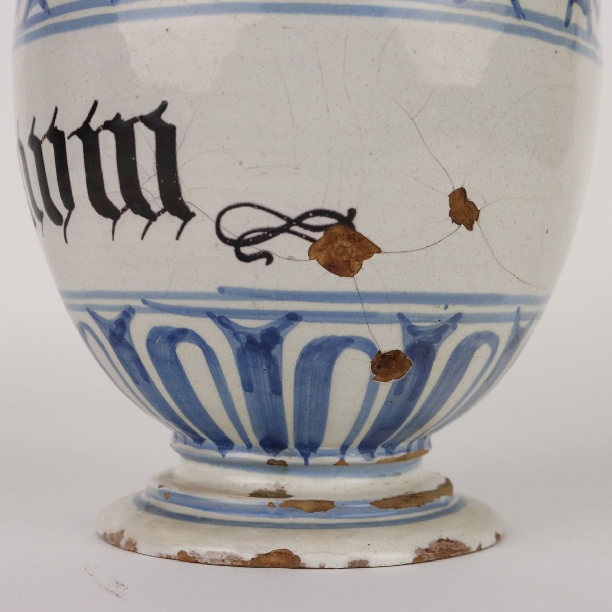 Majolica pharmacy jug with ovoid body and high neck and ribbon handle opposite the spout. Monochrome blue decoration with two wide bands framing the apothecary writing rendered in Gothic manganese characters. On the handle the coat of arms of the brotherhood. vases, service, plates, small sculptures, terracotta, porcelain, majolica, earthenware, ceramics, collector's articles, ancient objects.