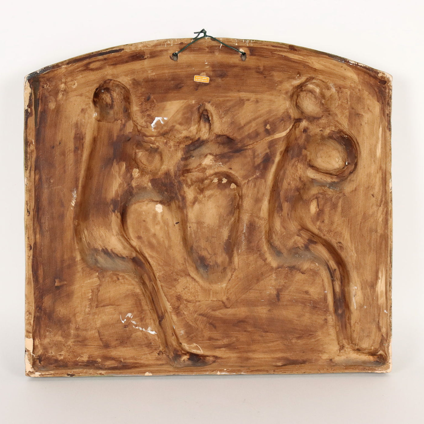 Polychrome ceramic tile with relief decoration depicting a grotesque harvest scene. Manufacturer sticker on the reverse. vases, service, plates, small sculptures, terracotta, porcelain, majolica, earthenware, ceramics, collector's articles, ancient objects.
