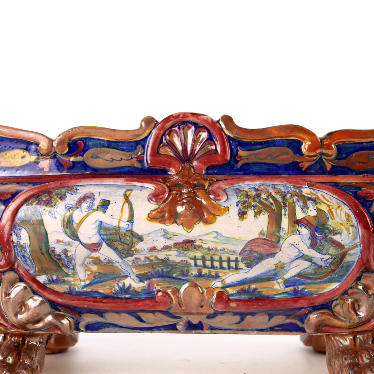 Luster majolica planter, third-fire painted in cobalt blue, gold and ruby. It features reserves on a white background with mythological scenes. Feral-shaped feet and snakes in the handles. Manufacture of Alfredo Santarelli, Gualdo Tadino. Manufacture mark in blue under the base. vases, service, plates, small sculptures, terracotta, porcelain, majolica, earthenware, ceramics, collector's articles, ancient objects.