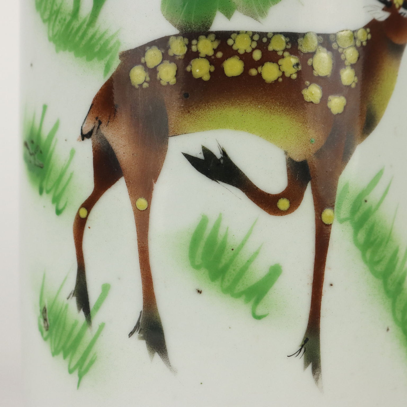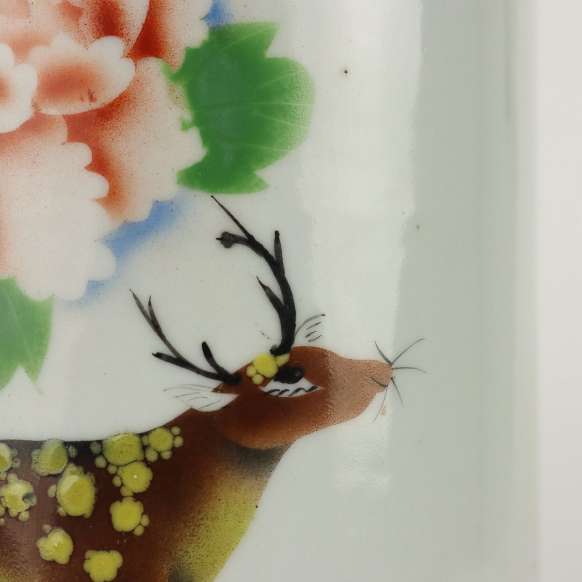 Brush holder vase decorated with polychrome enamels with a deer among large peony flowers collector's articles, ancient objects, porcelain, ceramics.