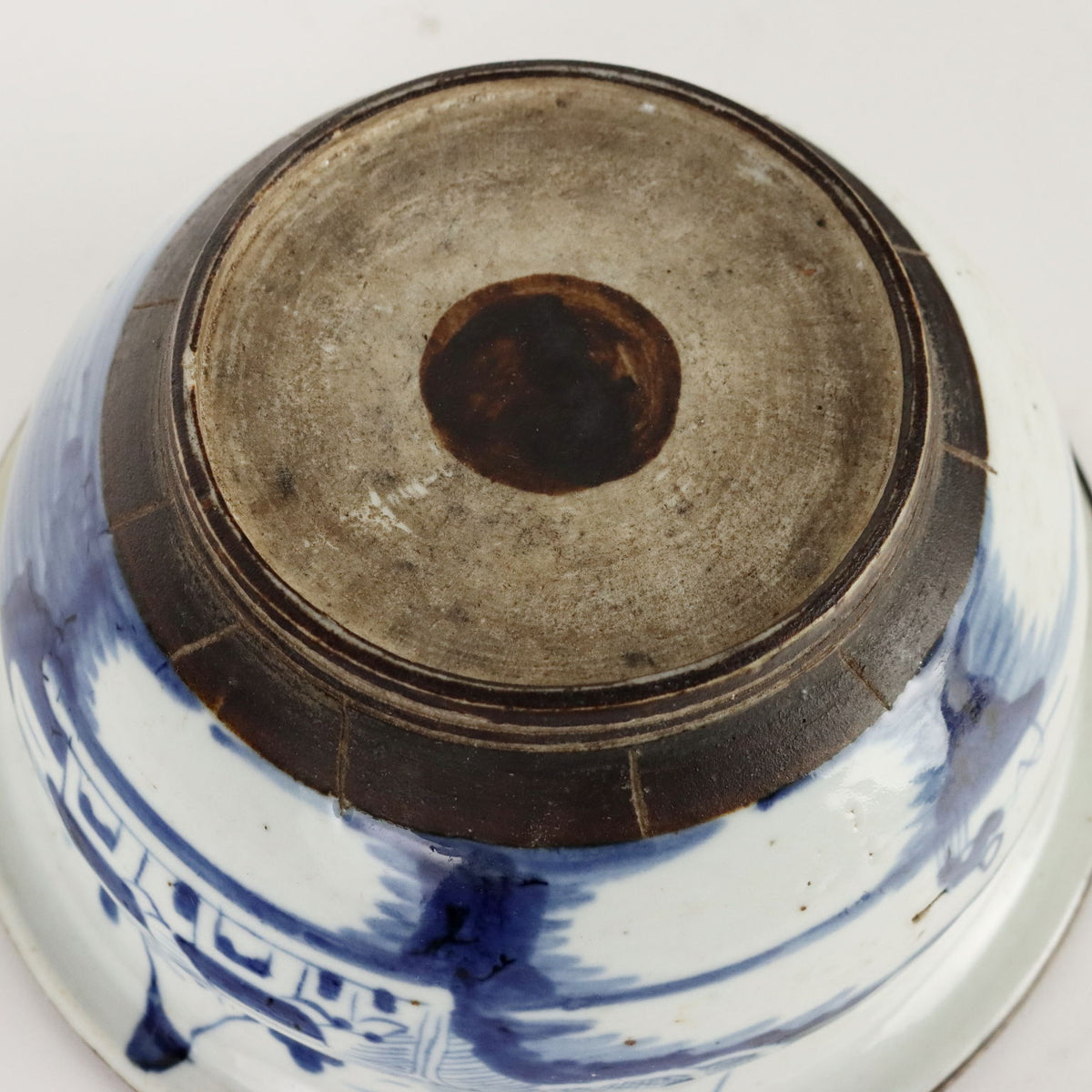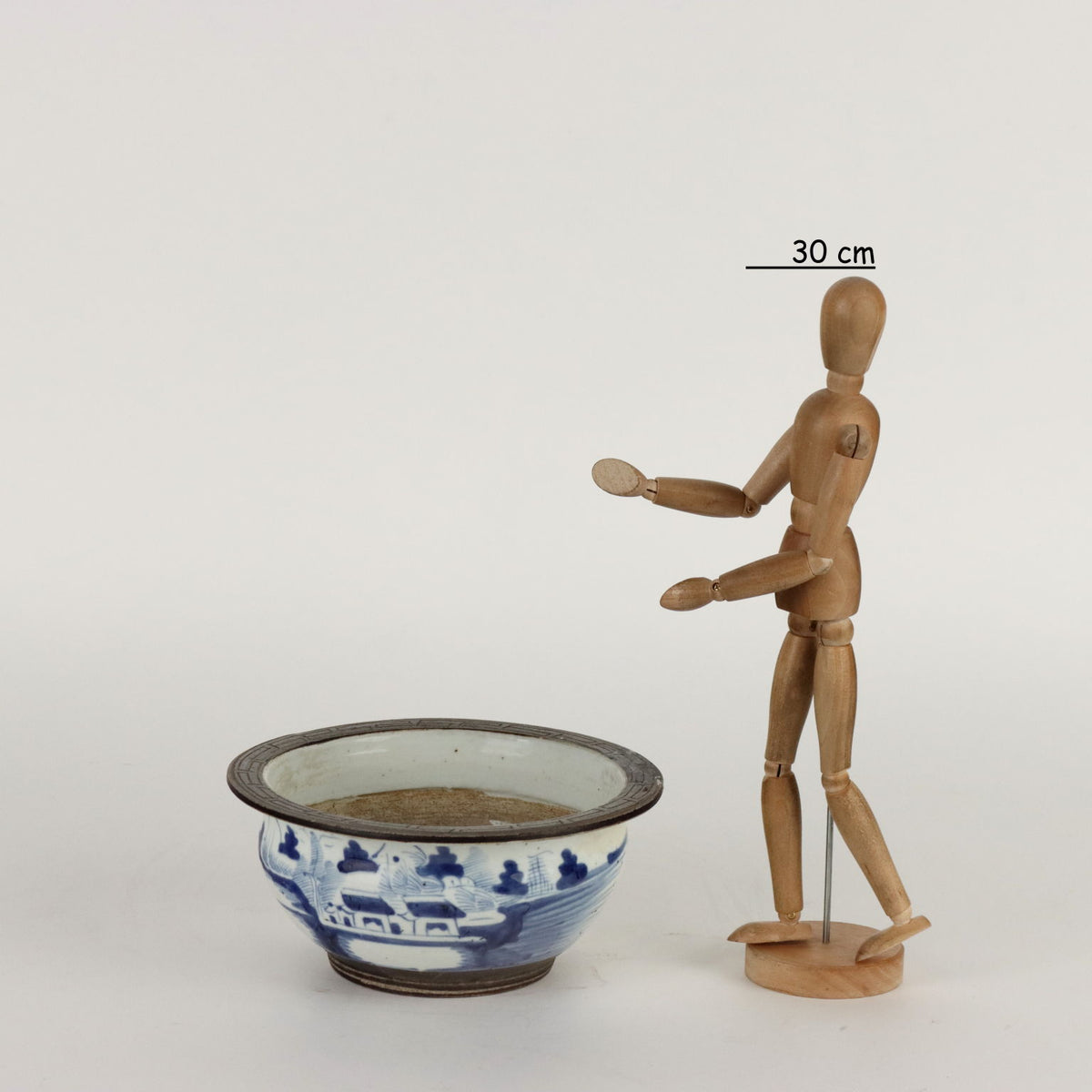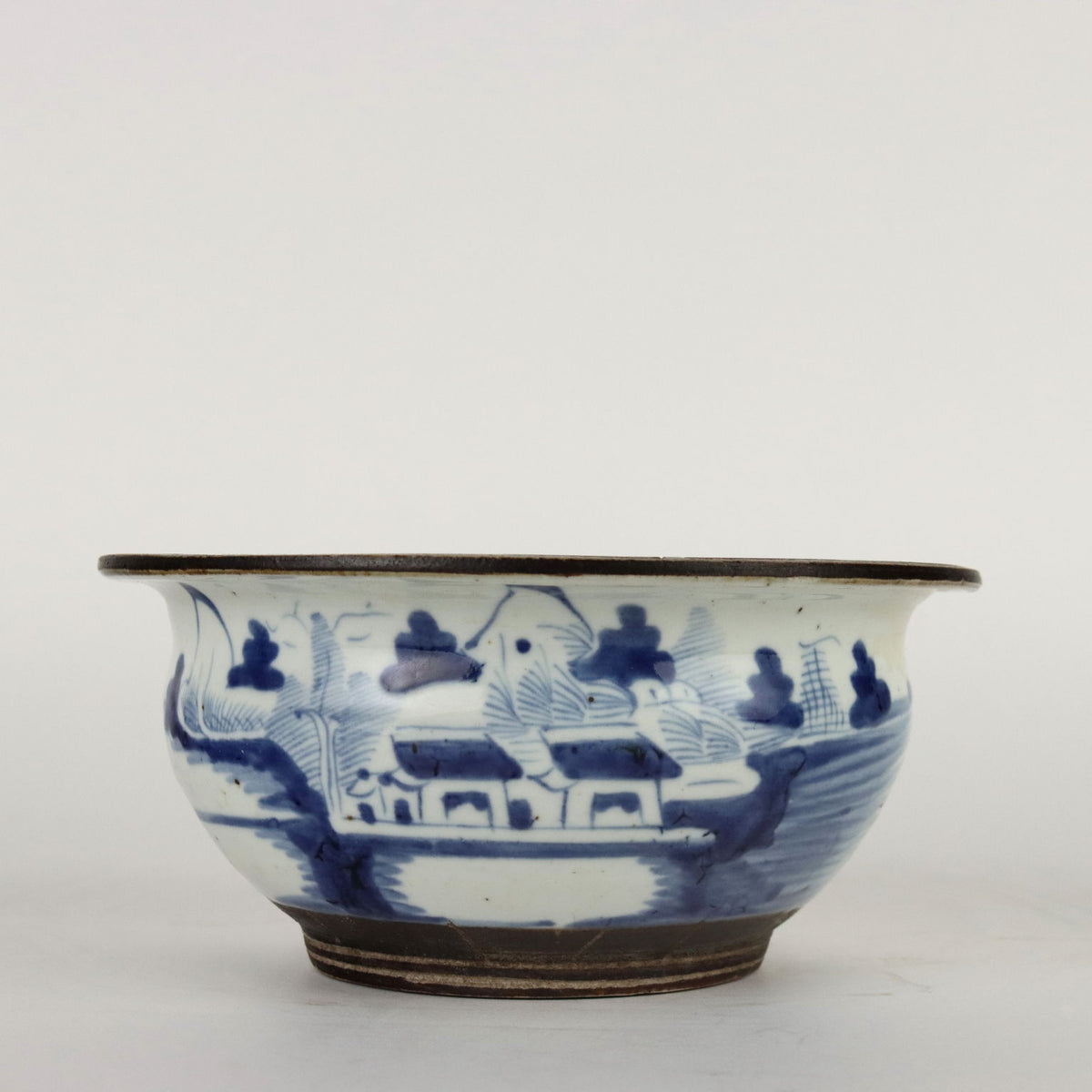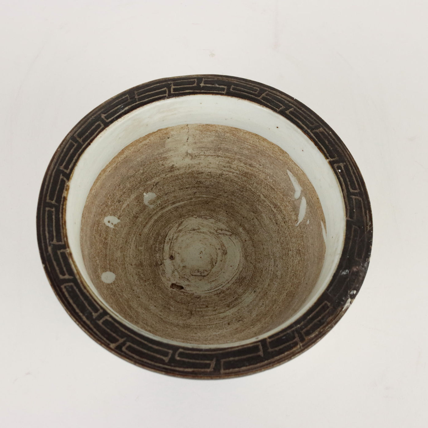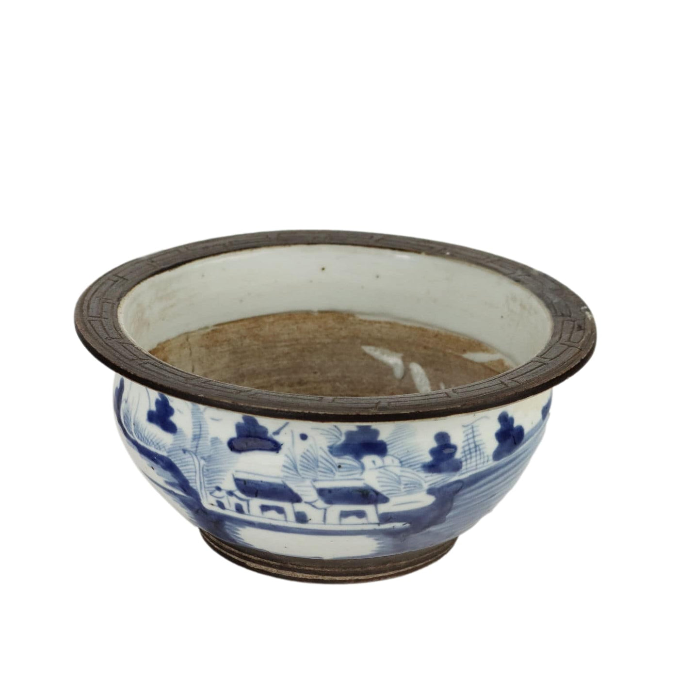 Glazed stoneware bowl with decoration of houses on the banks of a river surrounded by stylized trees, all painted in blue below deck. Upper edge left without glazing with Greek decoration. vases, service, plates, small sculptures, terracotta, porcelain, majolica, earthenware, ceramics, collector's articles, ancient objects.