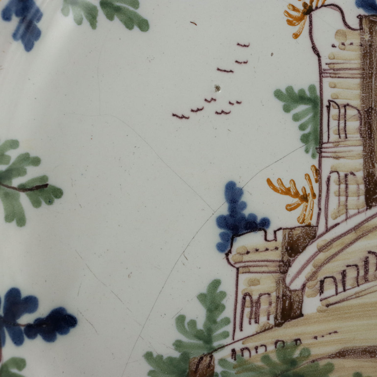 Majolica plate with lobed and molded rim. In the center of the plate a group of turreted buildings rises from an island of land with plants; the background is crossed by veils that represent the sky. Along the frame I decorate with leafy branches that come out from the perimeter. collector's articles, ancient objects, porcelain, ceramics.