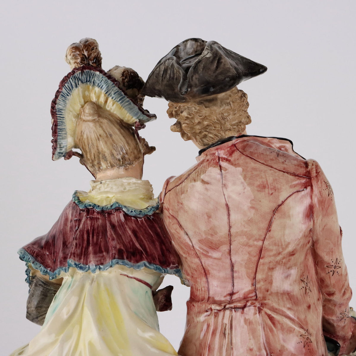 Large ceramic sculpture in art nouveau style depicting a gallant couple walking. Very realistic and accurate plasticity of the clothes and well-characterized faces. At the base impressed mark, initials of Brothers Urbach, brothers who worked in Teplitz Bohemia. collector's articles, ancient objects, porcelain, ceramics.