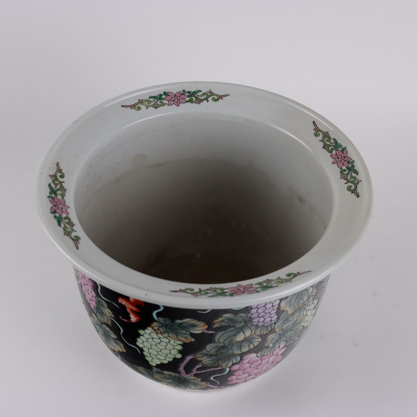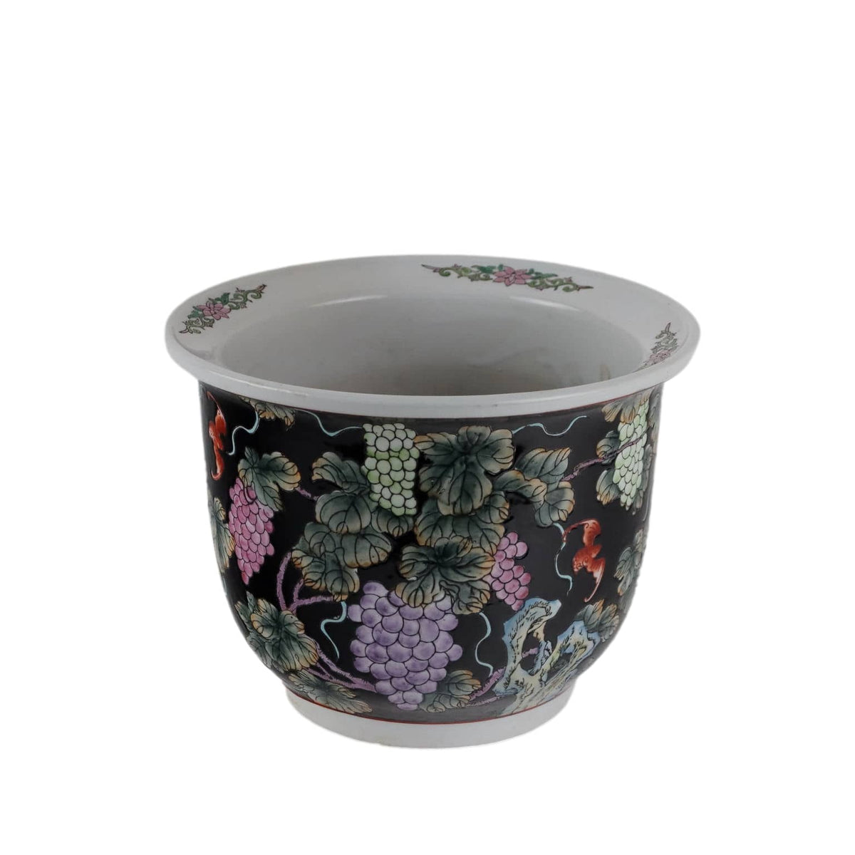 Porcelain cachepot decorated with vine leaves and grapes on a black background. collector's articles, ancient objects, porcelain, ceramics.