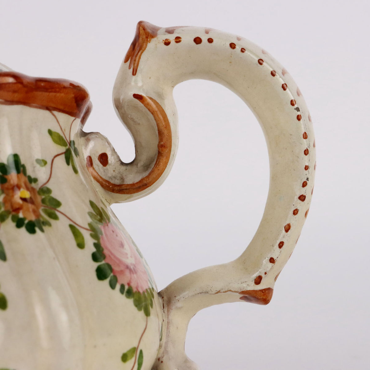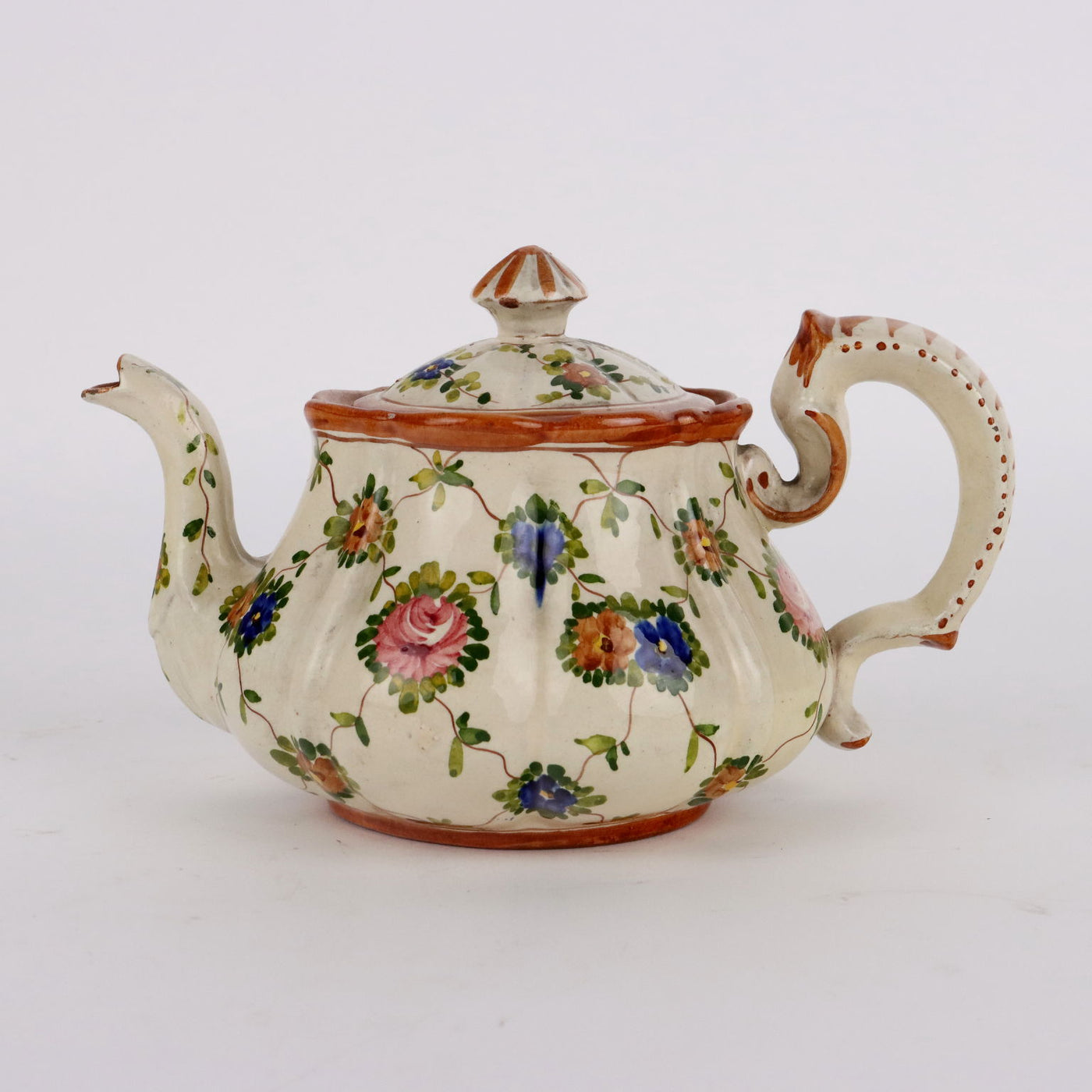 Tea set in polychrome majolica with floral decoration of scattered flowers. Manufacturer's mark under the bases. The set consists of a teapot, sugar bowl, milk jug, four cups and six skates. collector's articles, ancient objects, porcelain, ceramics.