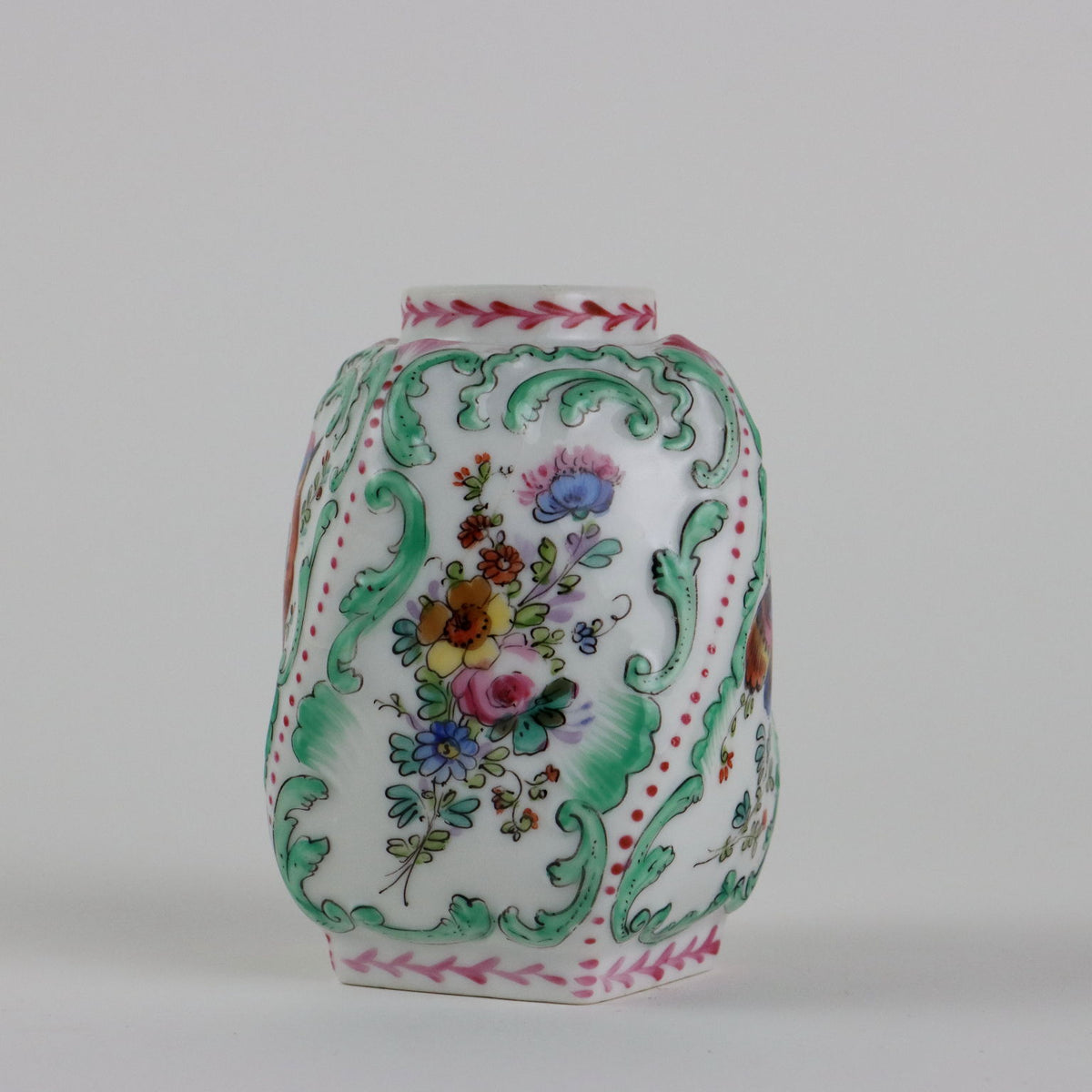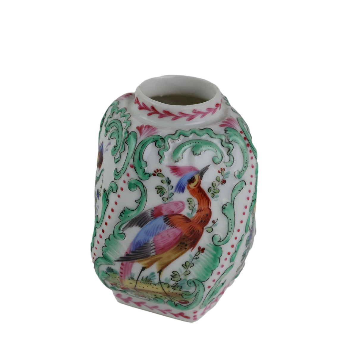 Twisted porcelain vase hand-decorated with birds of paradise and bunches of flowers. Painted manufacturers mark under the base. collector's articles, ancient objects, porcelain, ceramics.