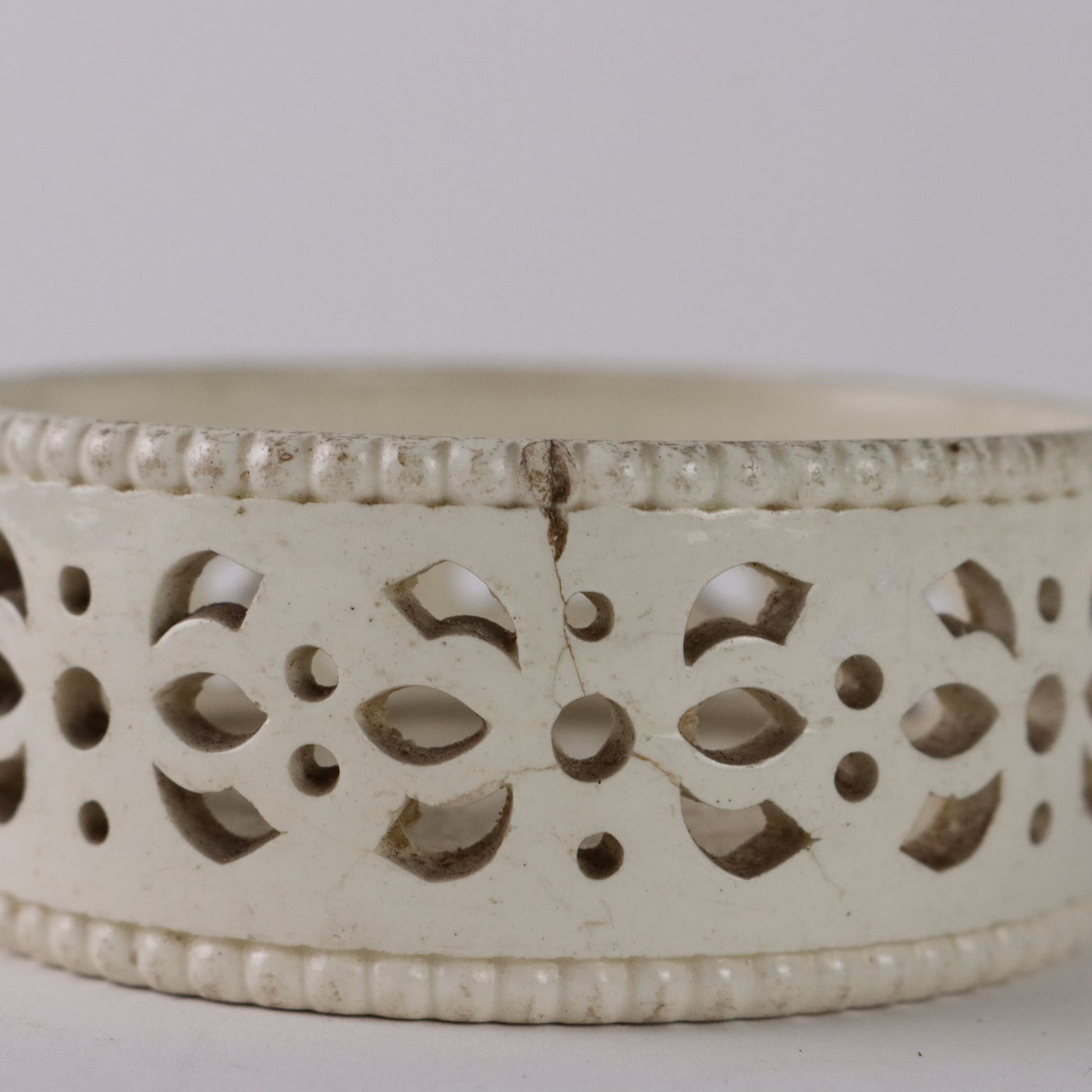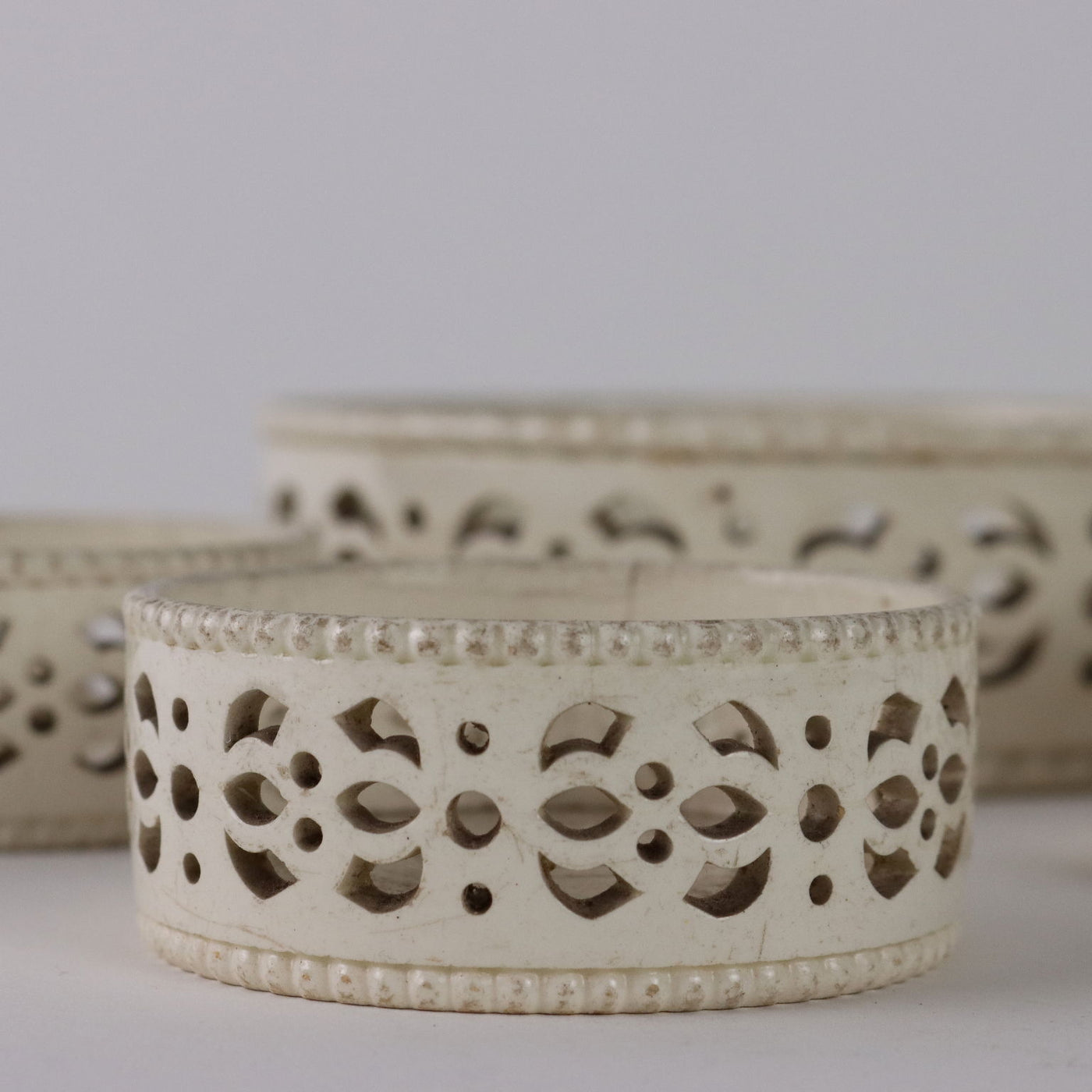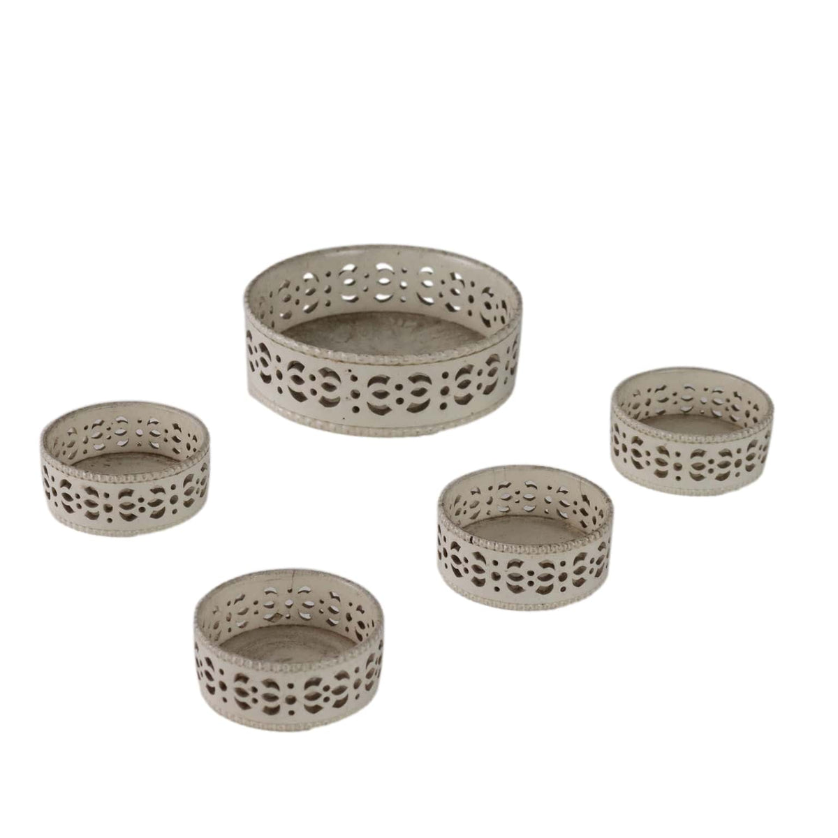 Earthenware table set consisting of a bottle coaster and four coasters. Fretworked edge. Manufacturer's mark under the bases. vases, service, plates, small sculptures, terracotta, porcelain, majolica, earthenware, ceramics, collector's articles, ancient objects.