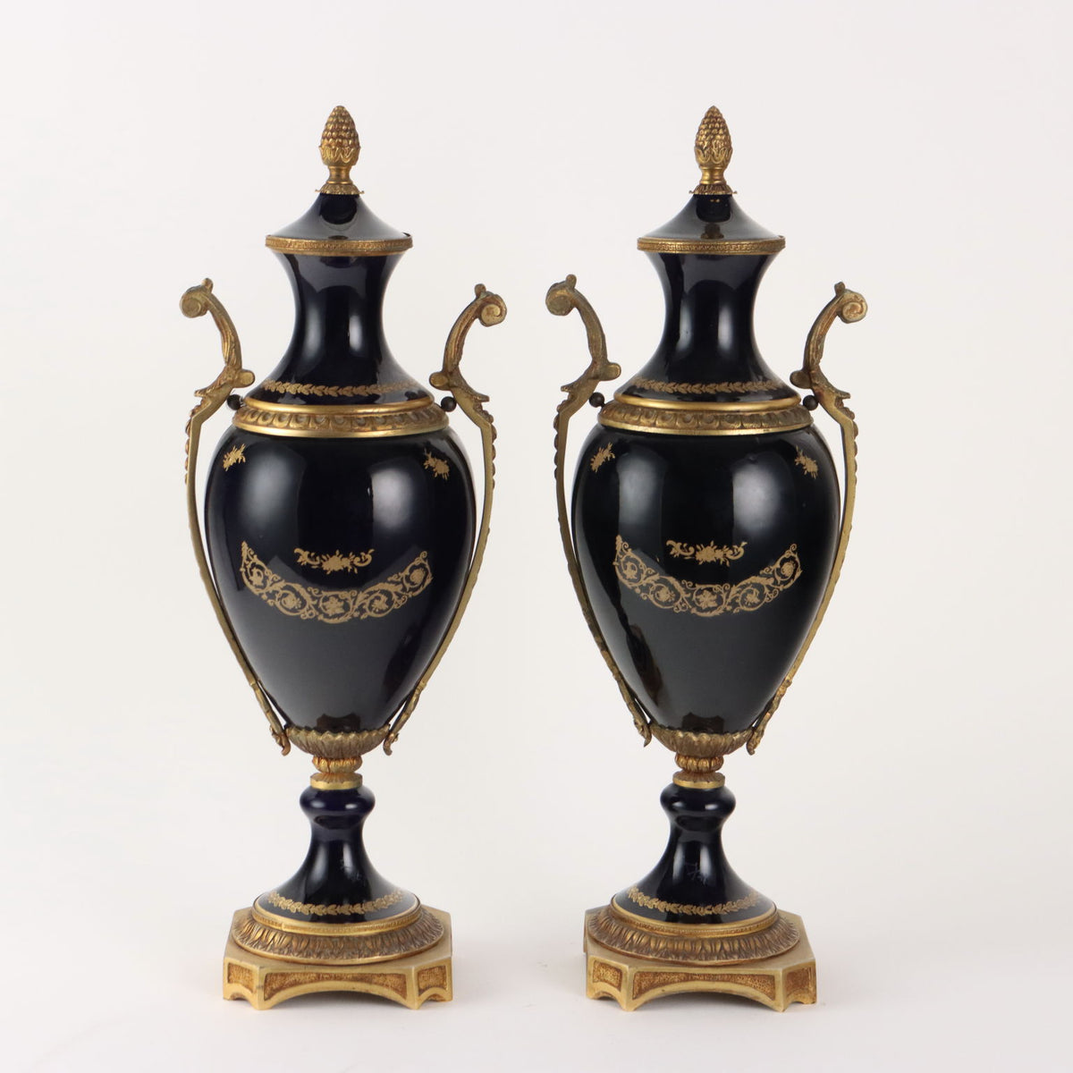 Pair of porcelain vases, probably Sèvres manufacture. Base and uprights in bronze, the body in cobalt blue porcelain has a medallion in the center decorated with gallant scenes. Decoration not entirely done by hand, retouched decal. collector's articles, ancient objects, porcelain, ceramics.