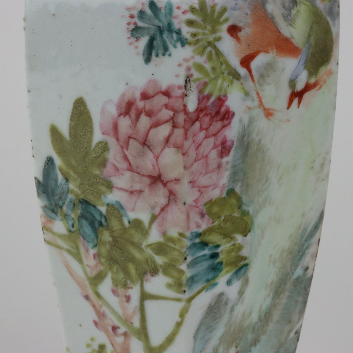 Hexagonal baluster vase painted in Qianjiang enamels with a bird on a rock surrounded by peony flowers. Long ideogram inscription on the back. collector's articles, ancient objects, porcelain, ceramics.