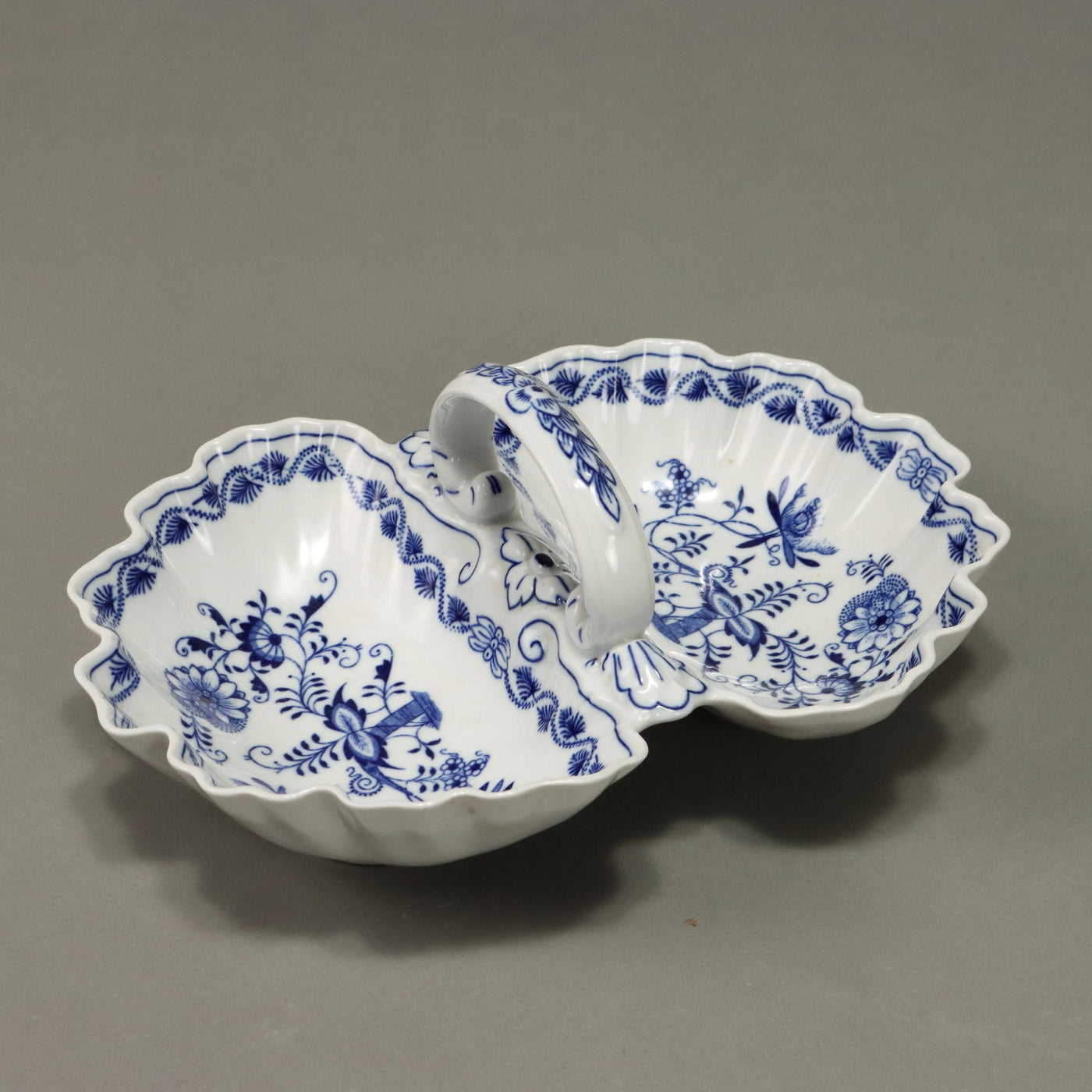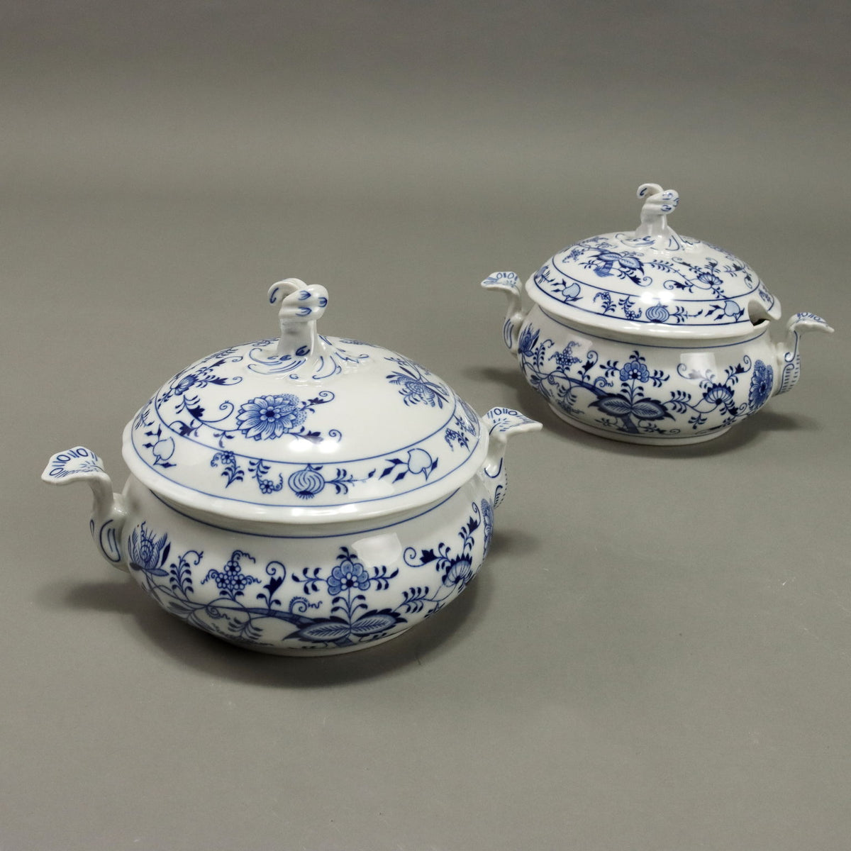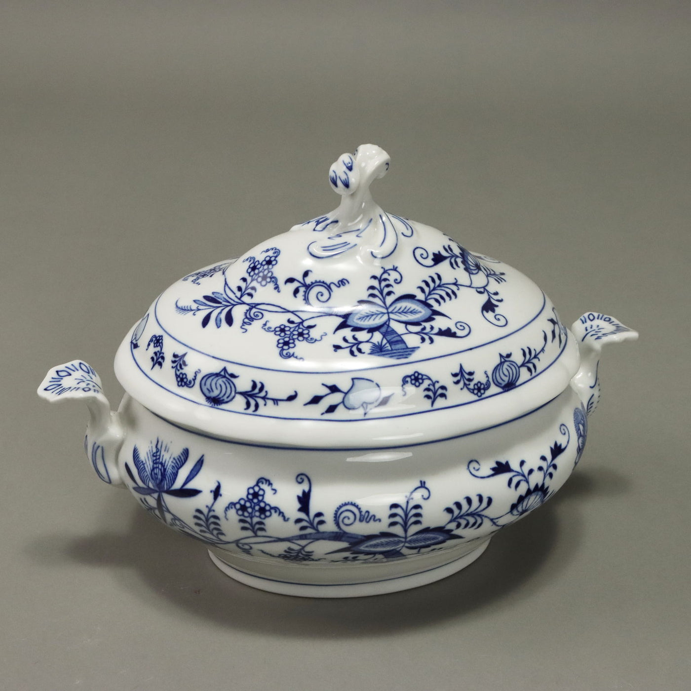 Porcelain dinnerware set with 'onion decoration'. The set consists of 1 soup tureen, 2 vegetable bowls, 1 gravy boat with spoon, 24 dinner plates, 12 soup plates, 12 dessert plates, 3 basins, 1 appetizer dish, 6 serving plates, 2 perforated baskets. Under the bases, the Original Zwiebelmuster Czechoslovakia manufacturing mark. collector's articles, ancient objects, porcelain, ceramics.