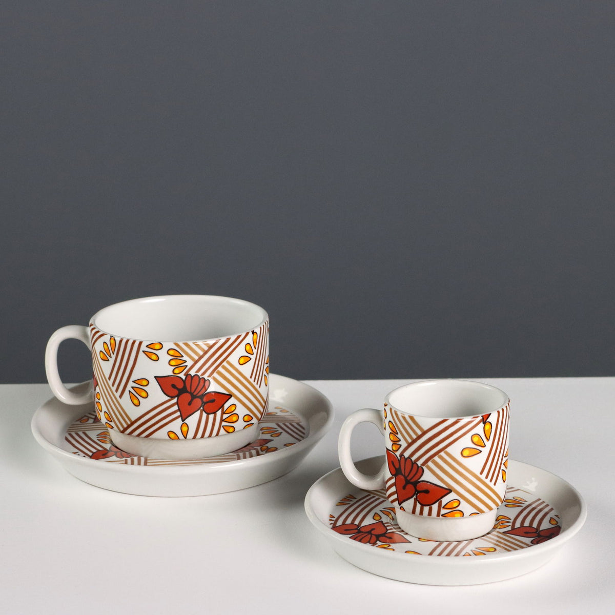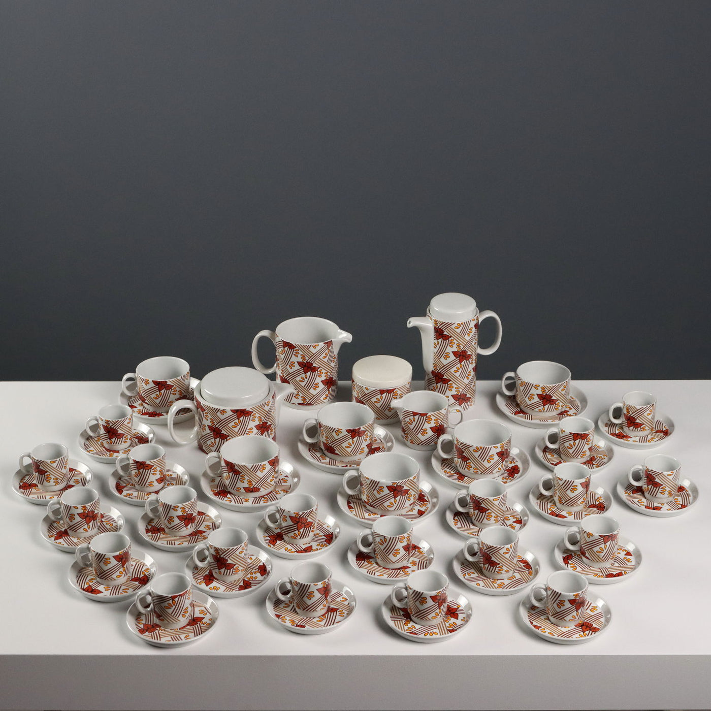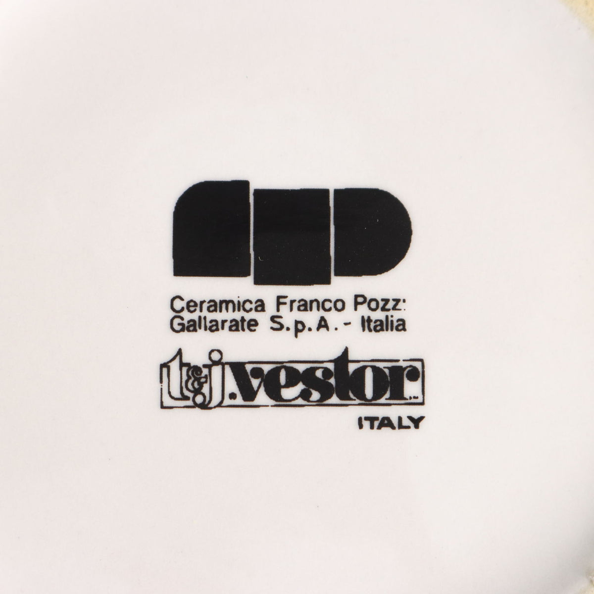 Coffee and tea service in porcelain with polychrome decorations 'Ceramiche Franco Pozzi Gallarate for T. & J. Vestor'. The service is composed of: 1 teapot, 1 coffee pot, 1 sugar bowl, 2 milk jugs, 6 teacups with saucers and 20 coffee cups with saucers. Manufacturer's mark under the bases. collector's articles, ancient objects, porcelain, ceramics.