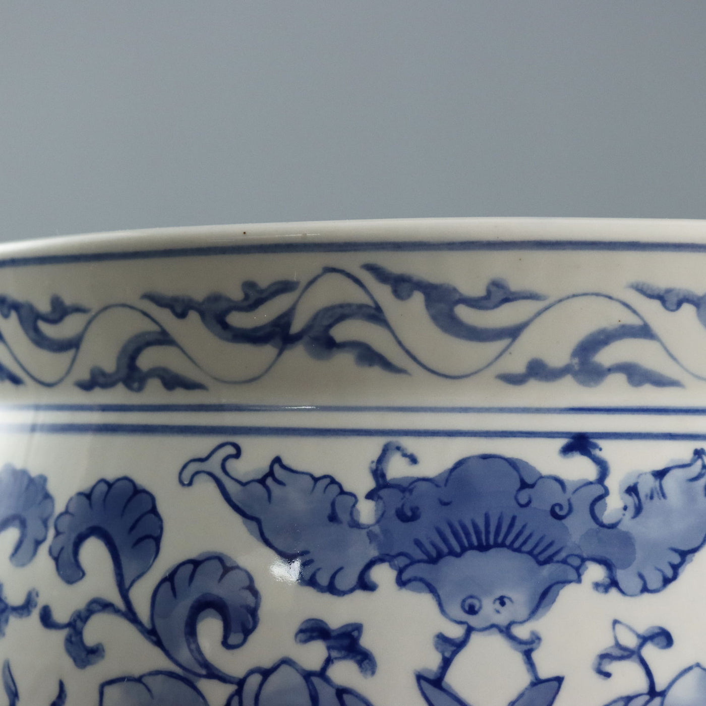 Porcelain cachepot vase with vegetal swirl decorations in shades of blue. collector's articles, ancient objects, porcelain, ceramics.