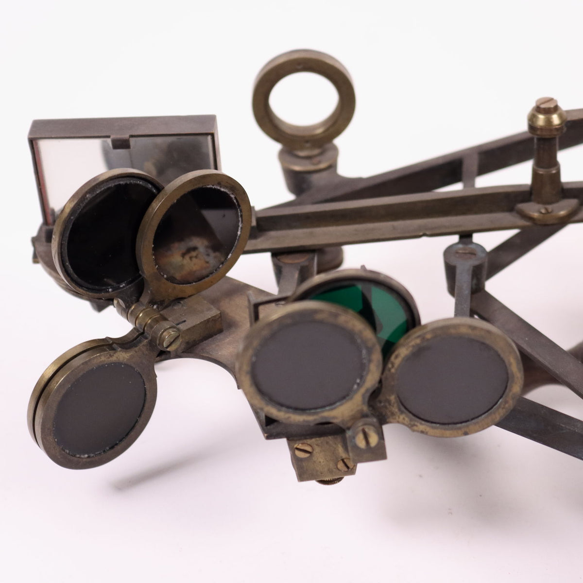 Sextant with brass frame, vernier with adjusting screw and microscope for reading, three coloured filters for the fixed mirror, four for the mobile mirror. Marked 'P. & G. Mattei Cardiff'. Scientific instruments, , musical instruments, collector's articles, vintage objects, 1960s articles, 1970s articles, 1930s articles, 1940s objects, 1950s objects, design articles.