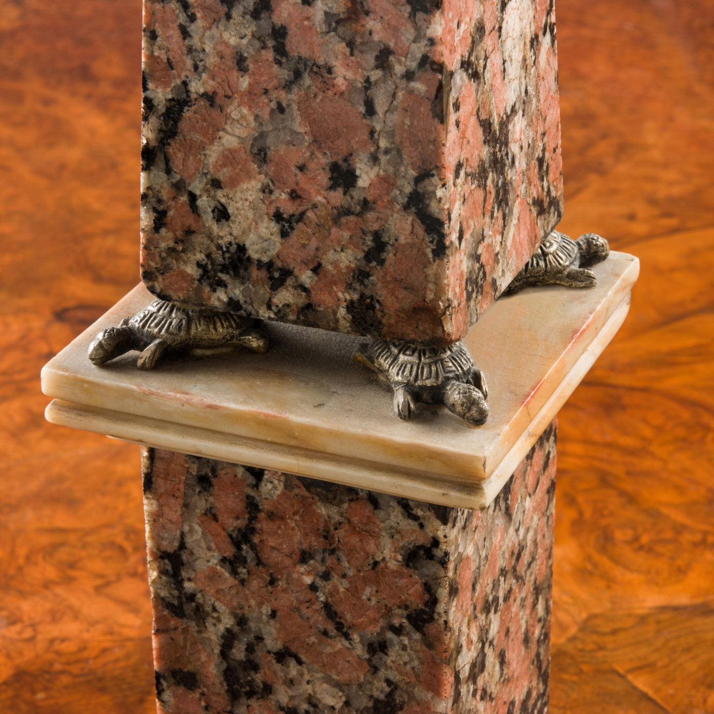 Pair of obelisks in red granite surmounted by two terrestrial and celestial globes in gilded bronze. The obelisks rest on two granite plinths with a base and capital in Giallo di Siena marble resting on gilded bronze feet; the two obelisks rest on plinths supported by 4 gilded bronze turtles. The bronze turtles are later embellishments. Ancient objects, , collector's articles, candle-holder.