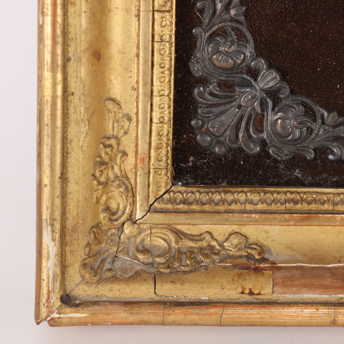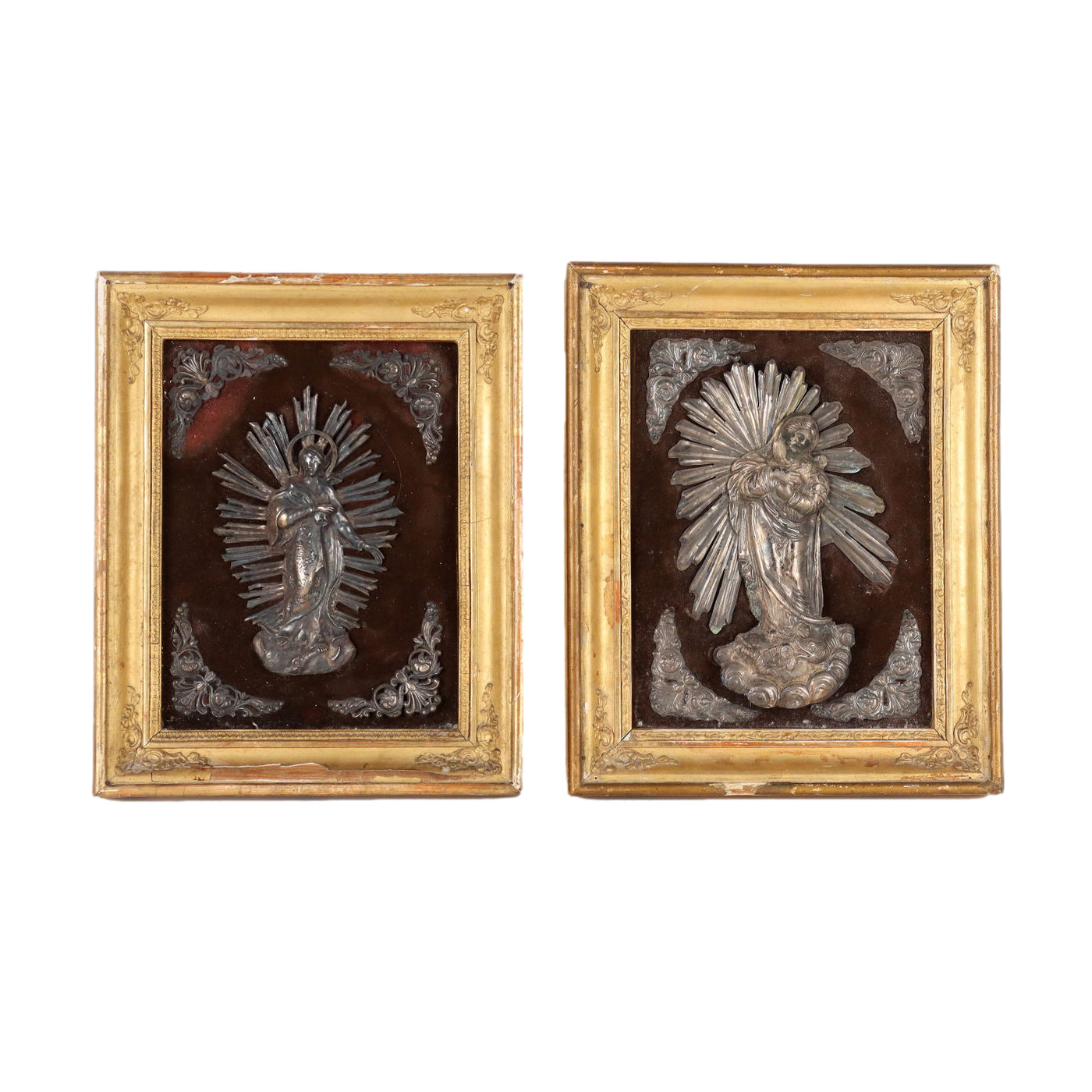 Pair of embossed silver plates depicting the Immaculate Conception of Italian manufacture; one has incussi marks but barely legible. The gilded wood frames with pastille decorations are contemporary. Ancient objects, , collector's articles, candle-holder.
