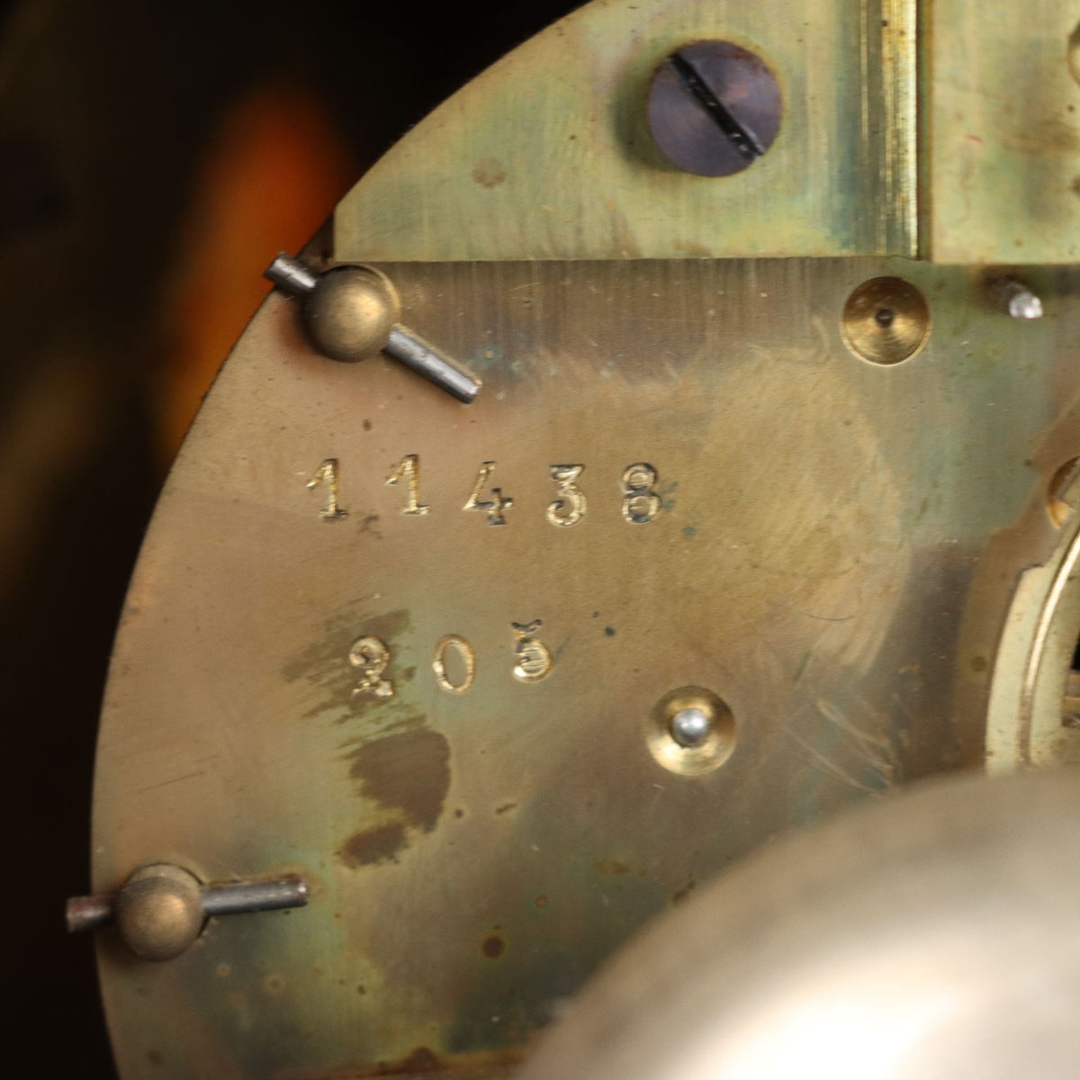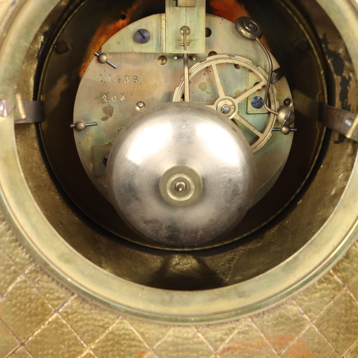 Triptych bronze clock with six-flame candelabra. Vegetable motifs, volutes and festoons held by a lion's head and lateral caryatids. Display with hours in Arabic numerals presented inside a gilt bronze wreath and protected by a glass lid. Clocks, gilded clock, chimney clock, countertop clock, table clock, tryptich, pendulum, parisienne.