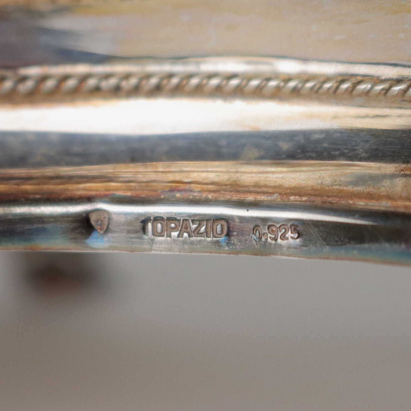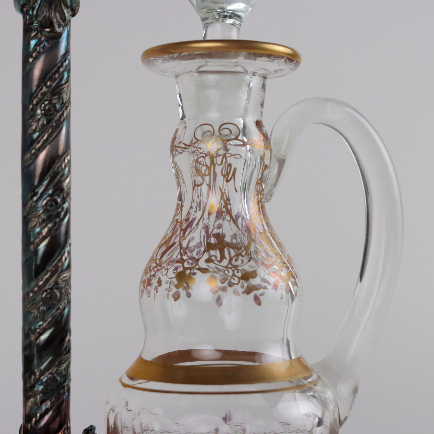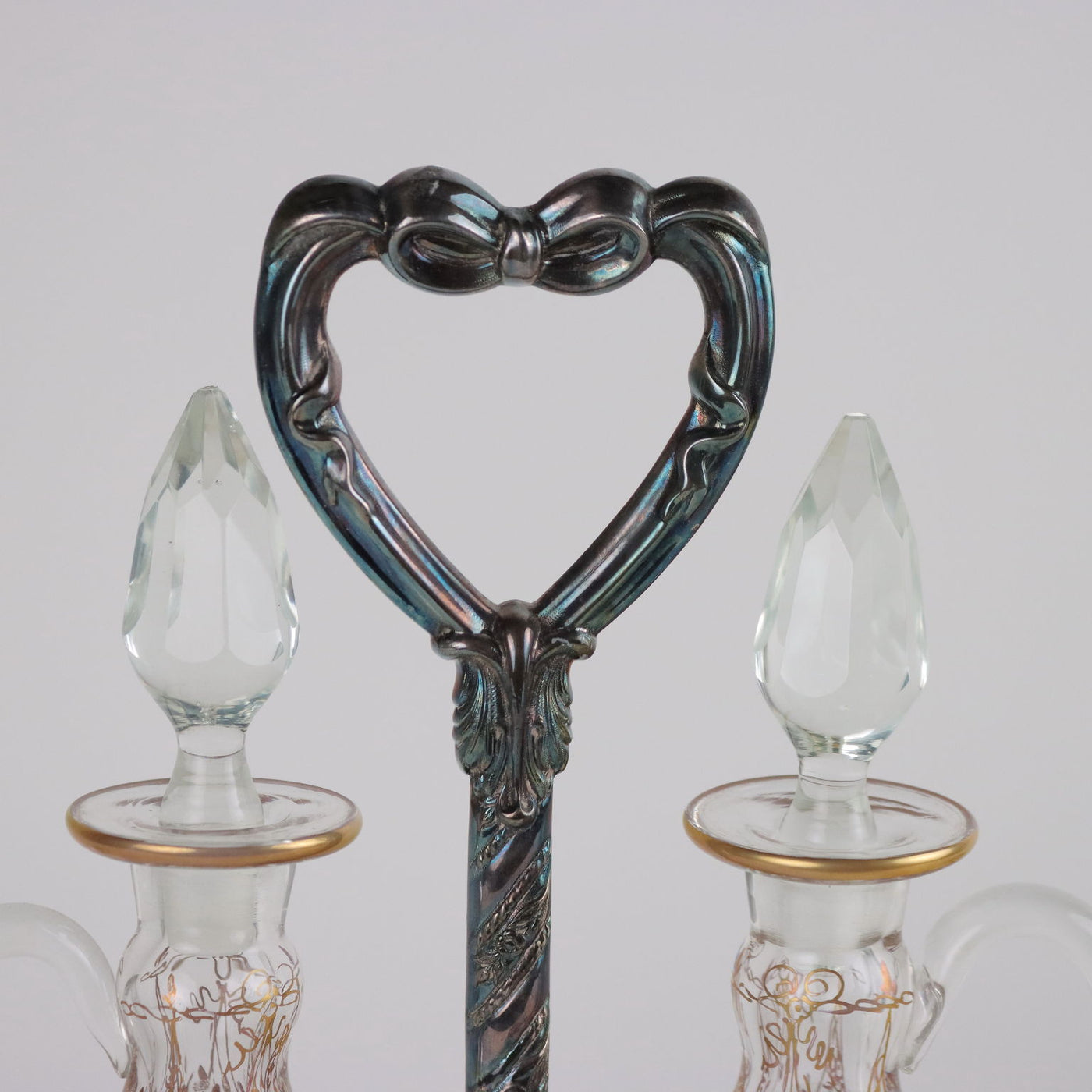 Embossed and pierced silver oil cruet with plant motifs, garlands and bows. Silver and silversmith's mark engraved on the front of the base. Bevelled glass cruets with gold decorations. Grams 540. Table sets, , collector's articles, ancient objects, table plates.